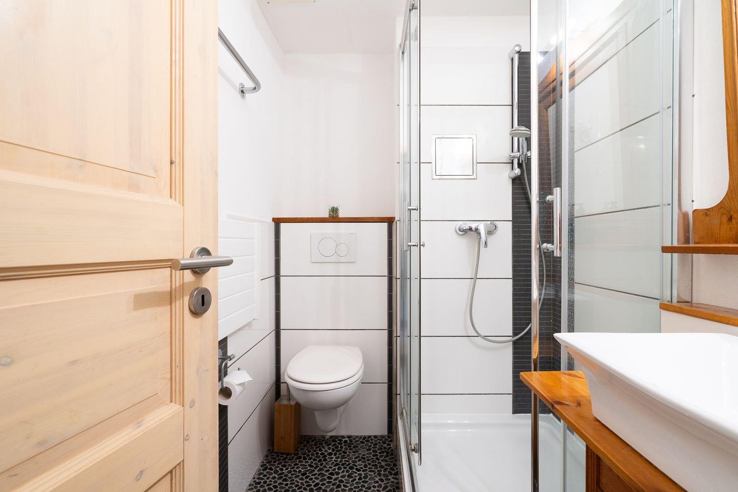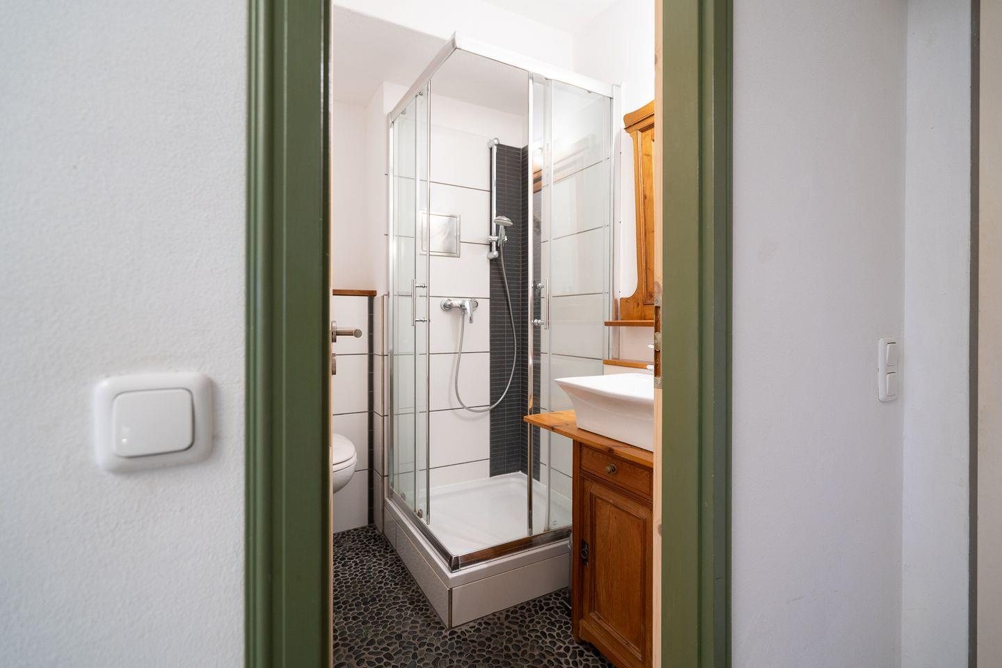 Das gepflegte Badezimmer mit Dusche ist mit einem Kieselsteinboden versehen, der die Füße nach einem langen Strandaufenthalt ganz nebenbei wohltuend massiert.
