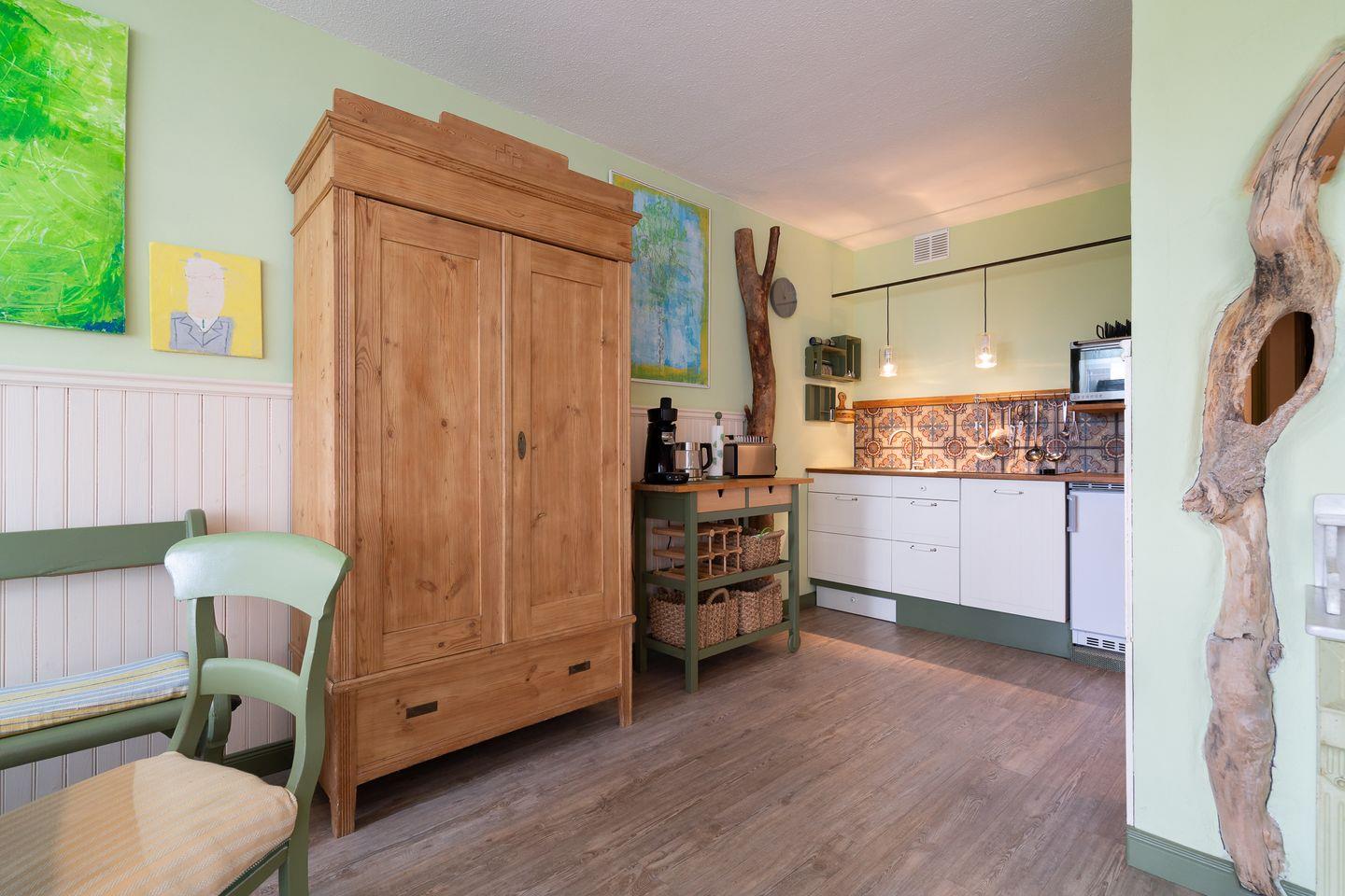 die mit viel Liebe zum Detail im schwedischen Stil eingerichtete Ferienwohnung liegt im Hochparterre mit einem Nord-Ost-Balkon und ein wenig Ostseeblick. Die mit Spülmaschine, Herd und kleinem Backofen ausgestattete Küche ist in den gemütlichen Wohn- und Essbereich integriert. Der innenliegende Schlafraum hat getrennte Betten. Im Wohnzimmer steht zudem ein Schlafsofa. Das moderne Duschbad ist innenliegend. Zum Strand sind es nur wenige Schritte.