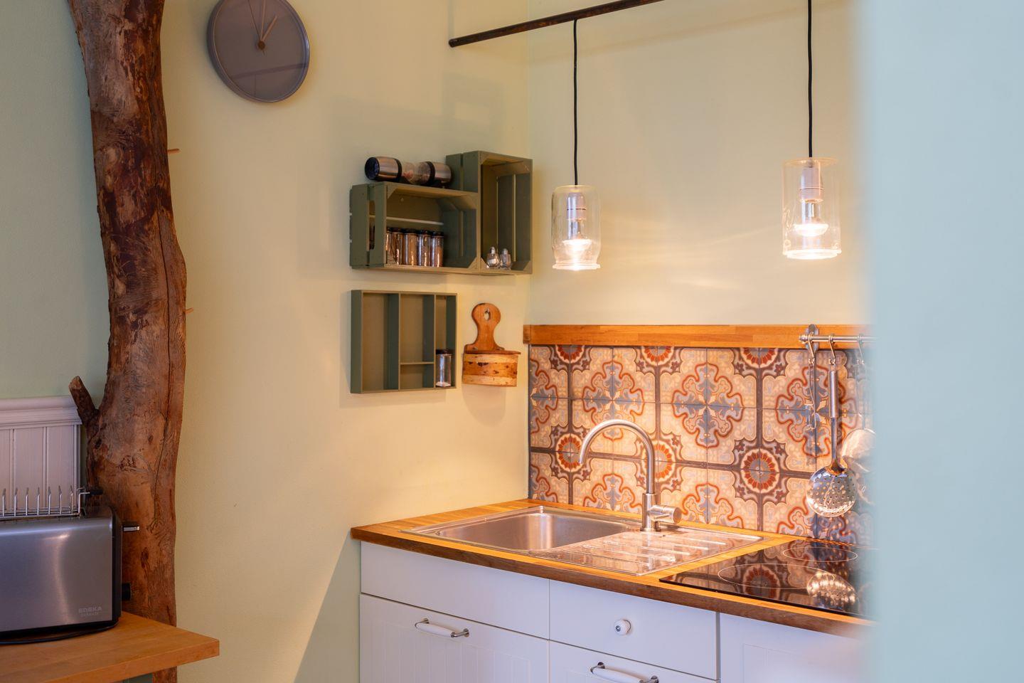 Die mit Spülmaschine, Herd und kleinem Backofen ausgestattete Küche ist in den gemütlichen kombinierten Wohn- und Essbereich integriert.