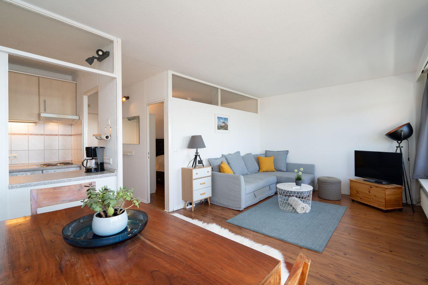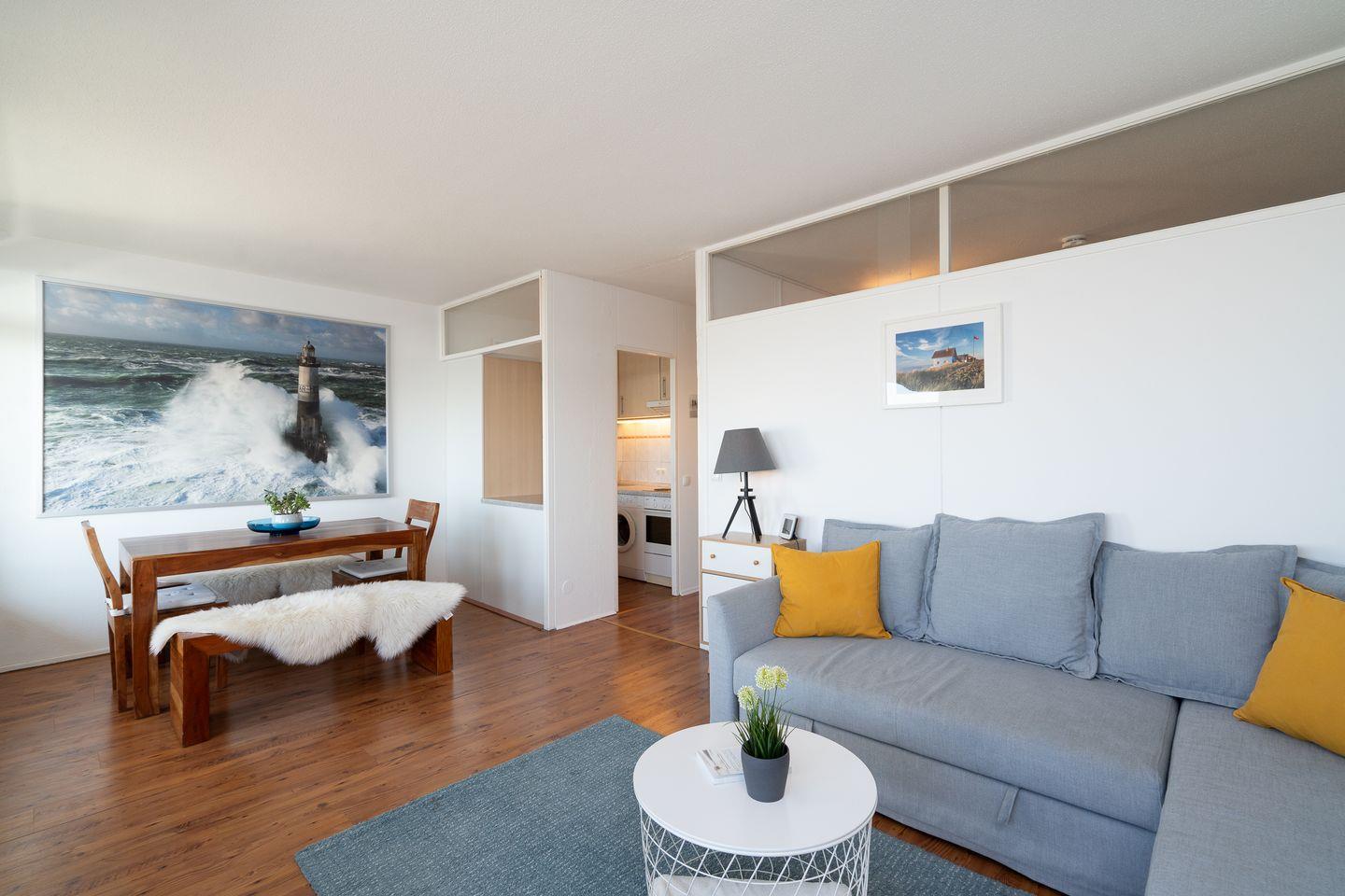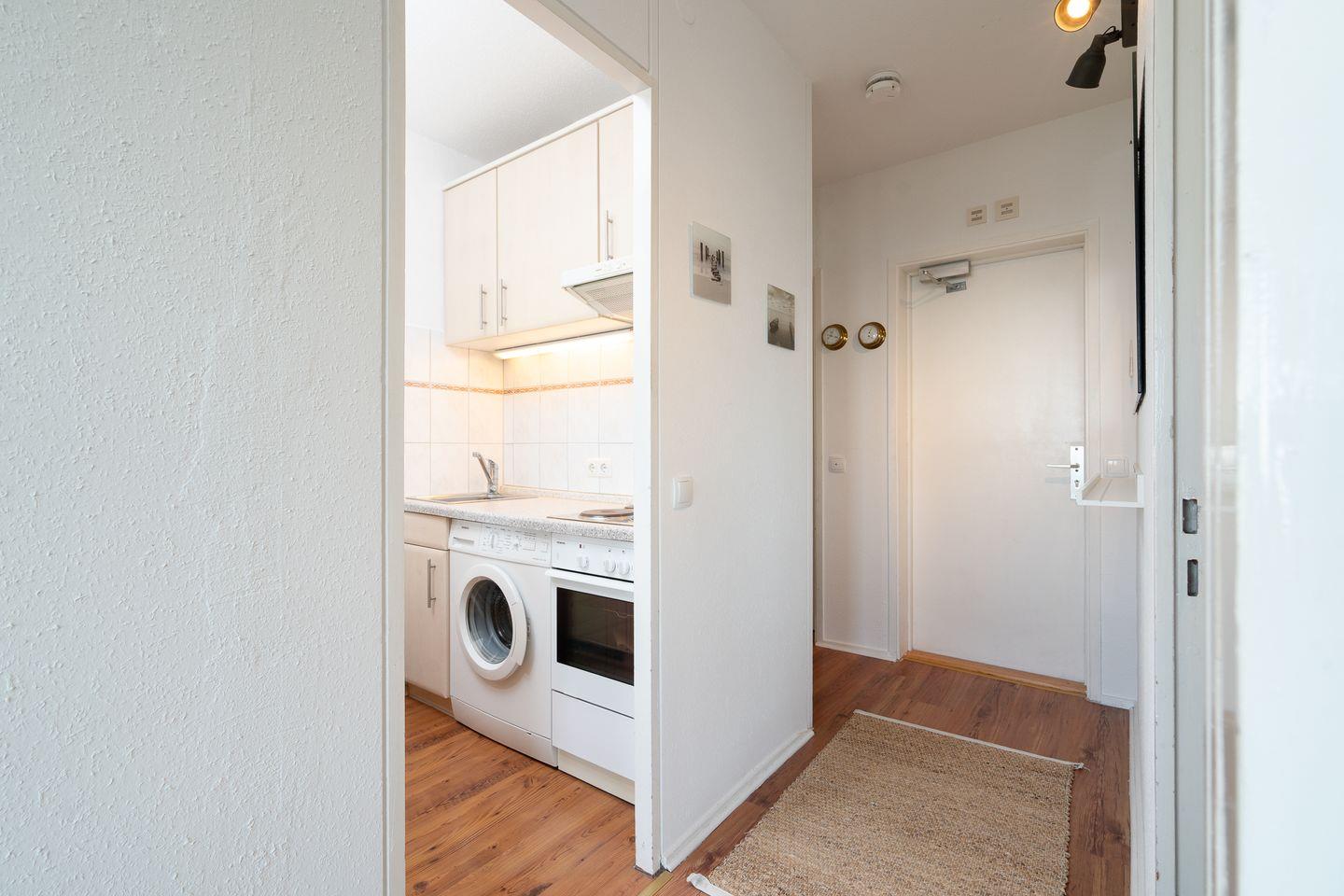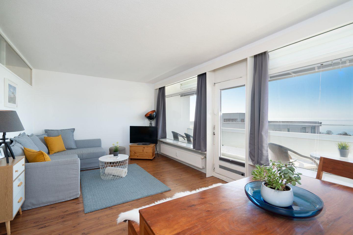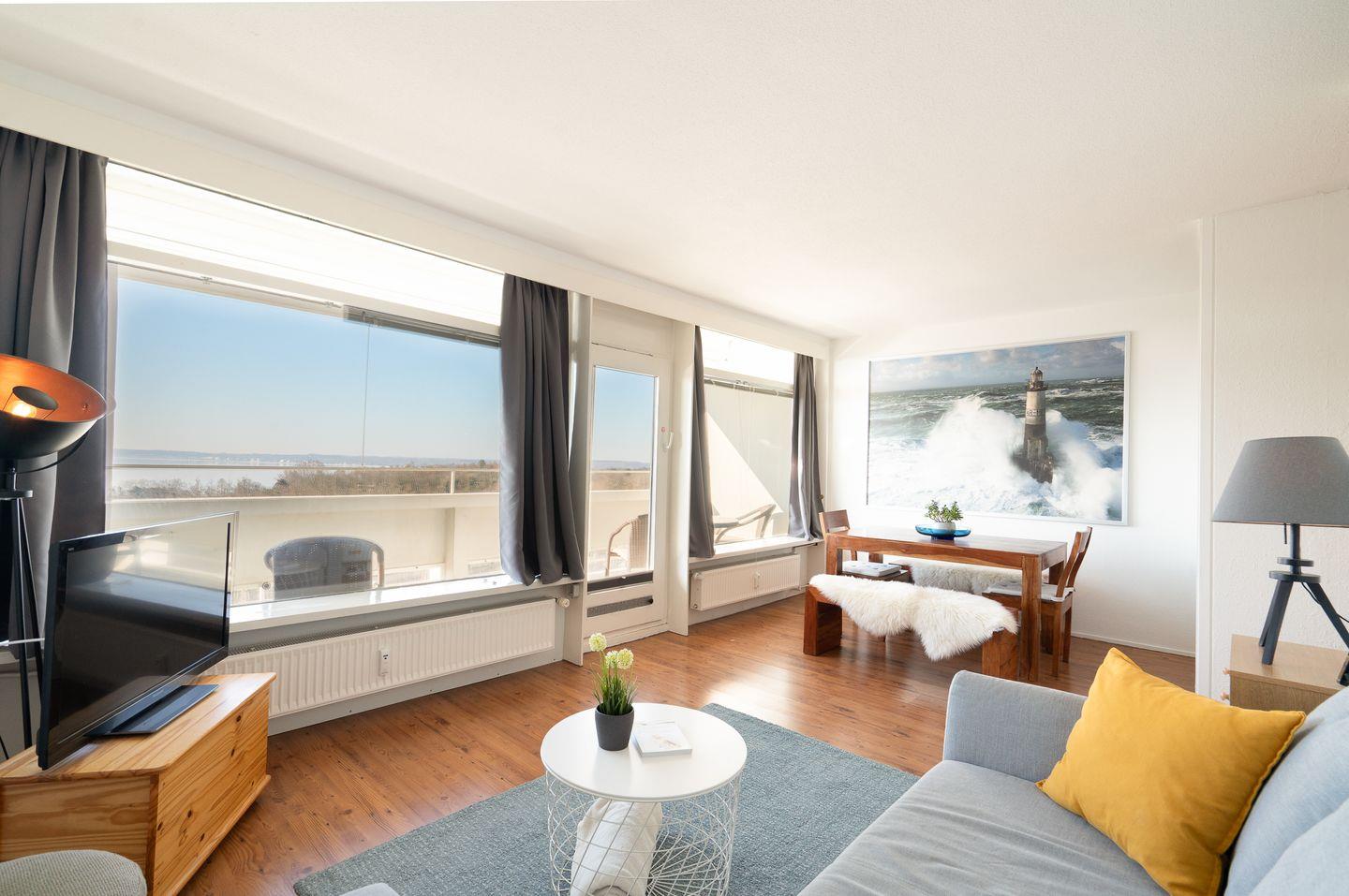 diese 2-Raum-Ferienwohnung liegt in sonniger Südlage in der 7. Etage. Vom Balkon können Sie einen schönen Ostseeblick über die Lübecker Bucht genießen. Die kleine Küche ist mit einer Durchreiche zum kombinierten Wohn- und Essbereich hin offen und mit Backofen, Herd und einer Waschmaschine ausgestattet. Im innenliegenden Schlafraum steht ein Boxspringbett (160 cm x 200 cm) und ein Kleiderschrank. Auf der Schlafcouch (140 cm x 200 cm) könnte eine weitere Person schlafen. Das moderne, hell geflieste Duschbad ist innenliegend. Zum Strand sind es nur wenige Gehminuten. PKW-Stellplatz inklusive.