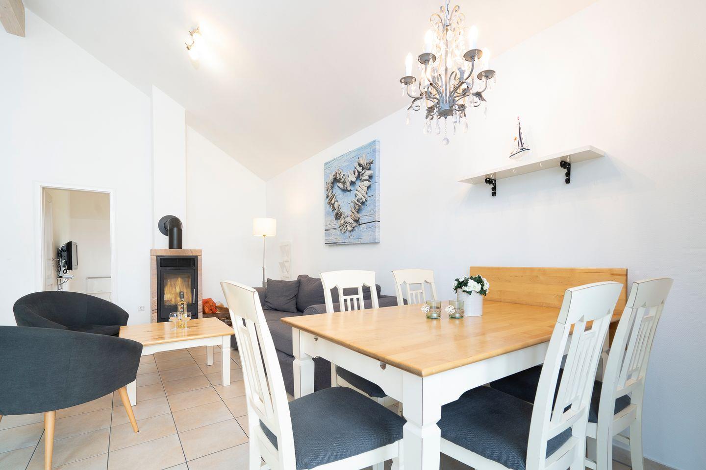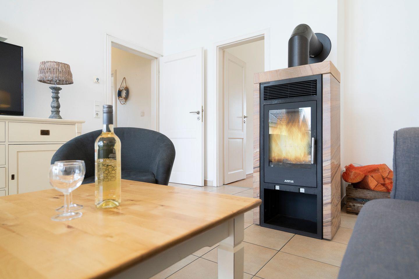 Auf 70 qm auf einer Ebene stehen Ihnen 2 Schlafräume, einmal mit Doppelbett (2x 80 x 200 cm) und einmal mit drei Einzelbetten (je 90 x 200 cm), ein geräumiger und gemütlicher Wohn- und Essraum mit Kamin und Zugang zur Terrasse zur Verfügung. Der Kaminofen sorgt für gemütliche Stunden mit Freunden und Familie. Die zum Wohn- und Essbereich offene Küche ist mit Geschirrspülmaschine, Herd und Backofen voll ausgestattet. Im Bad finden Sie auch die Sauna, sowie eine Dusche. Der Komfort einer eigenen Sauna wird sehr von unseren Wintergästen geschätzt. Eine Waschmaschine gehört ebenfalls zur Ausstattung. Die Beheizung erfolgt über Elektroheizungen und den Kamin.