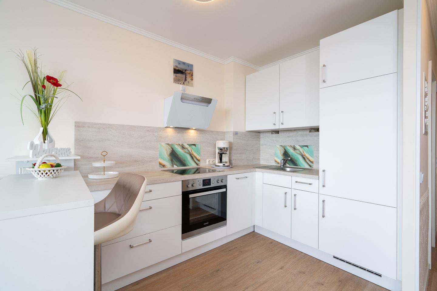 Es erwartet Sie eine moderne und gemütliche 2-Raum-Ferienwohnung in der 9. Etage der Apartmentanlage Ferienpark. Der möblierte Süd-West-Balkon hat seitlichen Ostseeblick in die Lübecker Bucht. Die Wohnung ist ca. 42 qm groß und für bis zu 3 Personen ausgestattet. Die Küche ist in den Wohnraum integriert und mit Spülmaschine, Backofen und Herd ausgestattet. Der innenliegende Schlafbereich bietet ein Doppelbett (2x 80 cm x 200cm), die Couch (160 x 200 cm) im Wohnzimmer hat eine Schlaffunktion. Das moderne und helle Duschbad ist innenliegend. Der Strand ist mit wenigen Fußschritten erreichbar. PKW-Stellplatz inklusive.
