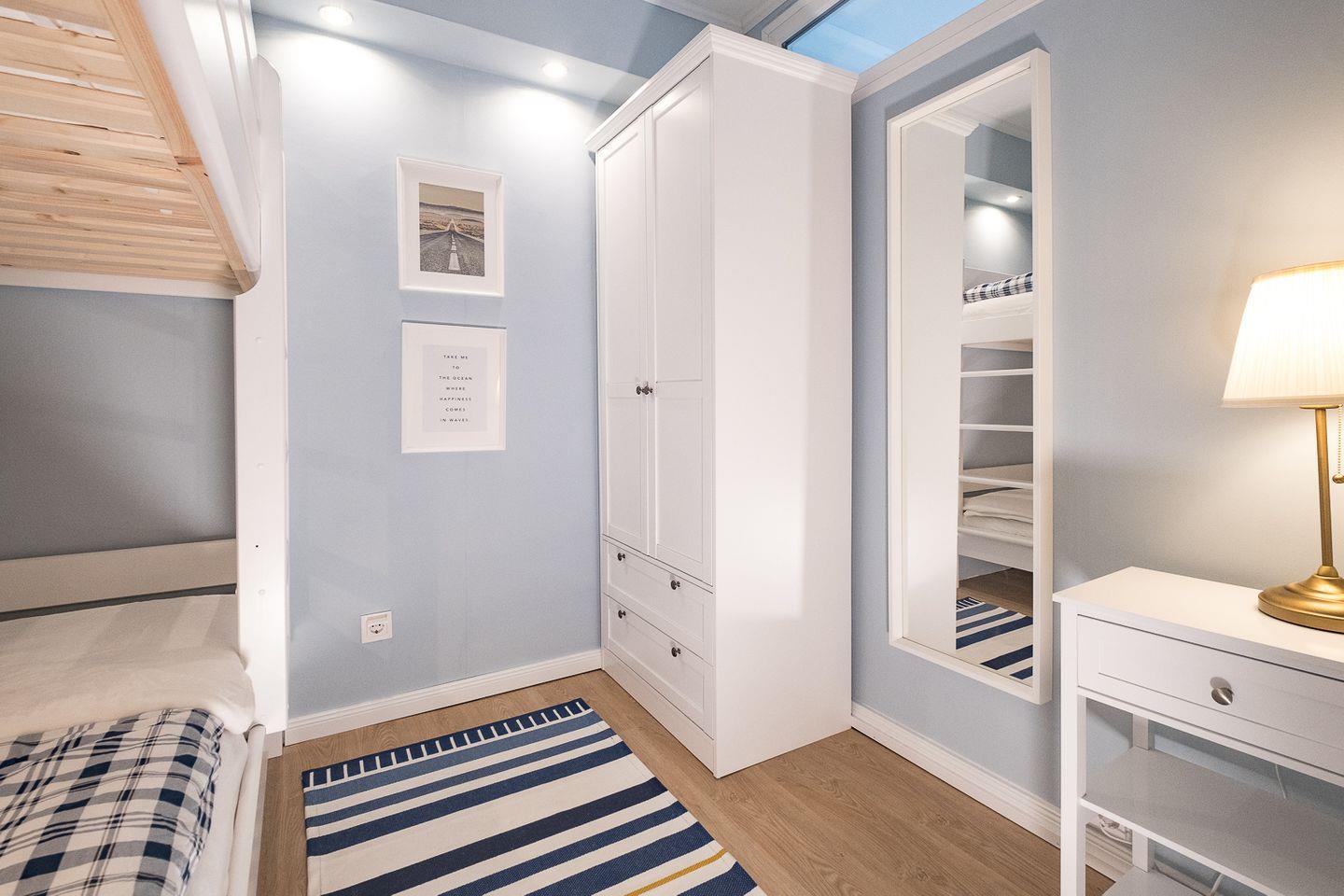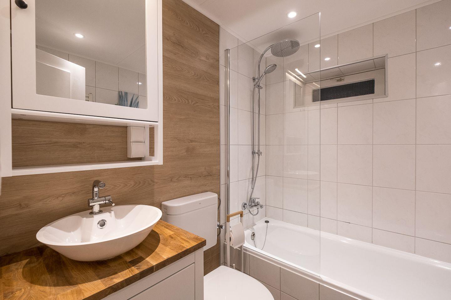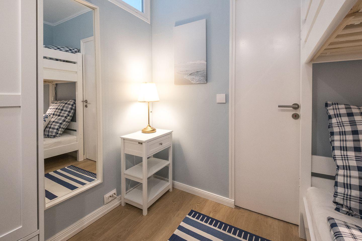 Zwei geschmackvolle Schlafzimmer, davon eins mit großen Fenstern zur Terrasse und Doppelbett (160 cm x 200 cm) sowie ein weiteres innenliegendes mit Etagenbett (2 Betten mit je 90 cm x 190 cm). Ein stilvolles Bad mit Duschwanne, Fön, Stauraum und Waschtrockner ergänzt das Wohlfühlen.