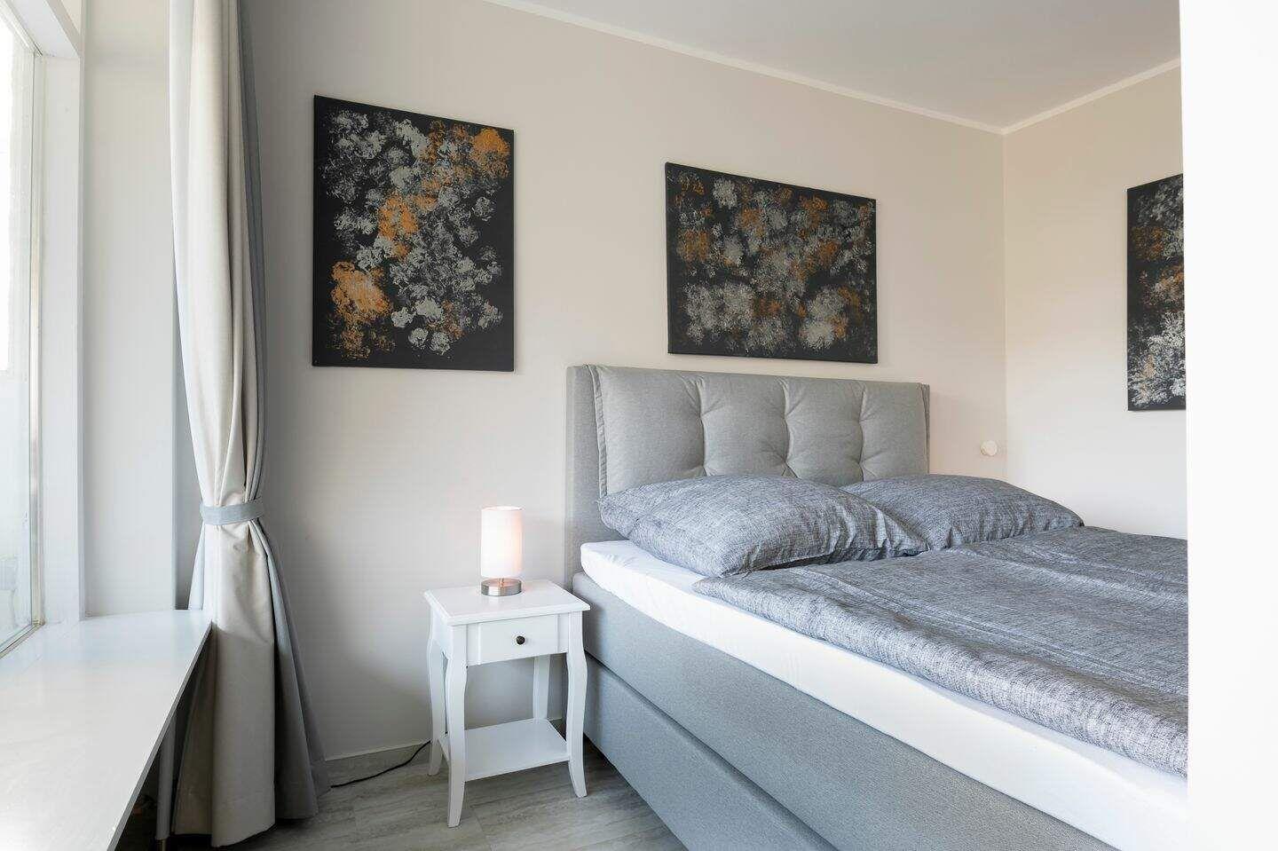 Der Schlafbereich ist optisch durch ein Sideboard und den großen Smart-TV abgetrennt. Im Schlafbereich erwartet den Urlaubsgast ein komfortables Boxspringbett (160x200cm) und sorgt für erholsamen Schlaf.