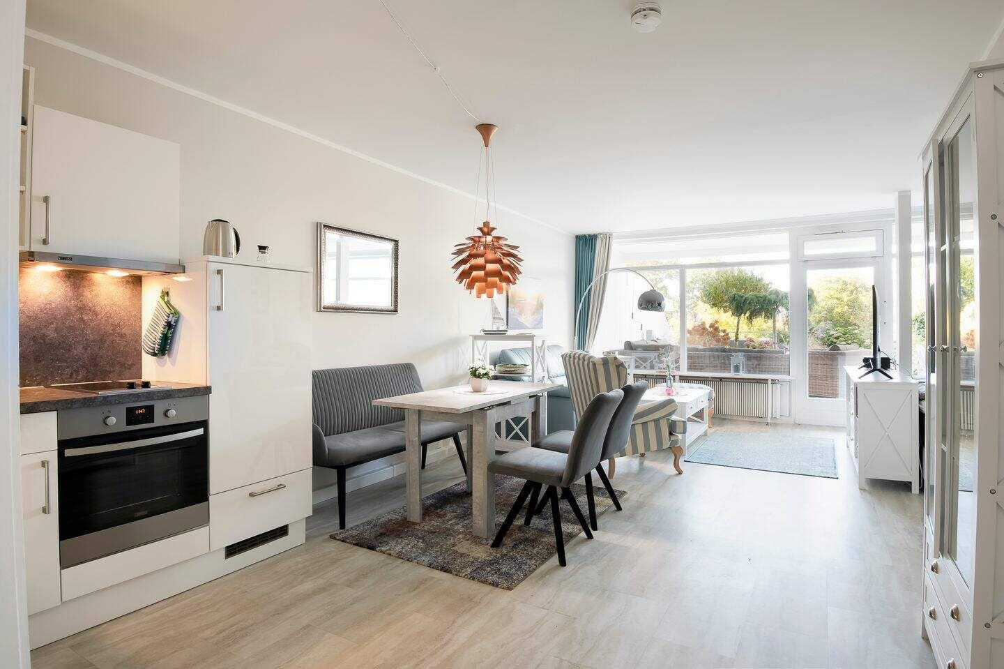 Hell, modern und mit viel Liebe zum Detail eingerichteter Wohn/Schlafraum mit gemütlichen und bequemen Sitzgelegenheiten, die zu entspannten Fernsehmomenten oder einer Buchlektüre einladen. In den Wohnraum integriert, befindet sich die voll ausgestattete Einbauküche mit allen Annehmlichkeiten. Die zubereiteten Speisen können Sie am direkt angrenzenden Esstisch mit 4 Sitzmöglichkeiten einnehmen.