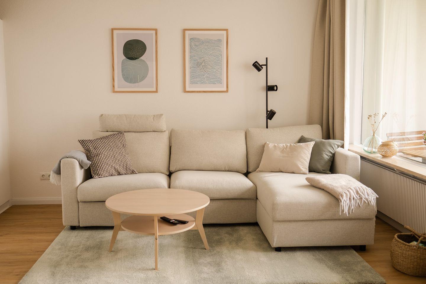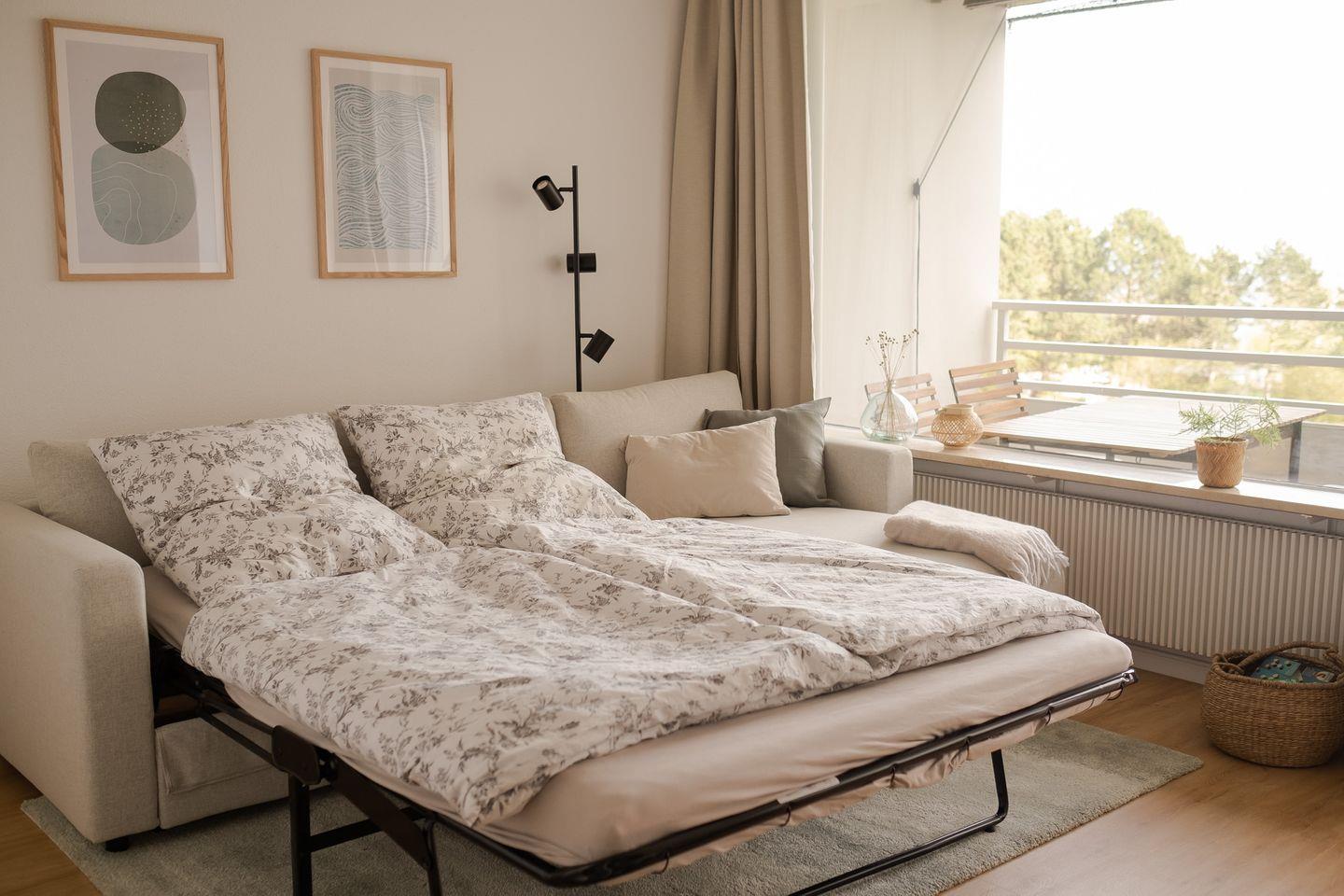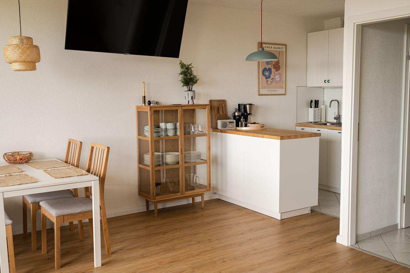 Die moderne und gemütlich eingerichtete Ferienwohnung verfügt über 2 Zimmer, die sich auf 42 Quadratmeter verteilen und wurde im Jahr 2023 saniert und neu möbliert. Das kombinierte Wohn- und Esszimmer ist mit einem bequemen Schlafsofa (140 x 200 cm), einem Esstisch und einem Flachbild-TV ausgestattet. Von hier aus haben Sie Zugang zum Balkon, von dem aus Sie einen herrlichen Blick auf die Ostsee genießen können. Die Küche ist mit Spülmaschine, Herd und Backofen voll ausgestattet und in den Wohn- und Essbereich integriert. Das Schlafzimmer ist mit einem ausziehbaren Doppelbett (2x 80 cm x 200 cm) eingerichtet. Das moderne Badezimmer verfügt über eine Dusche, ein Waschbecken und ein WC. Der Strand ist nur wenige Gehminuten entfernt. PKW-Stellplatz inklusive.