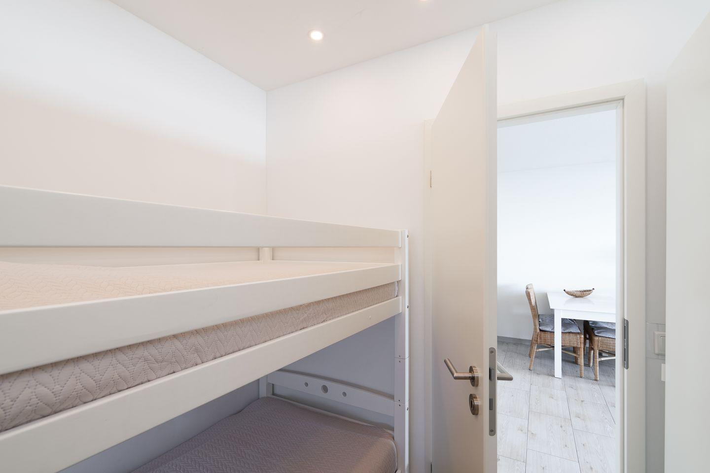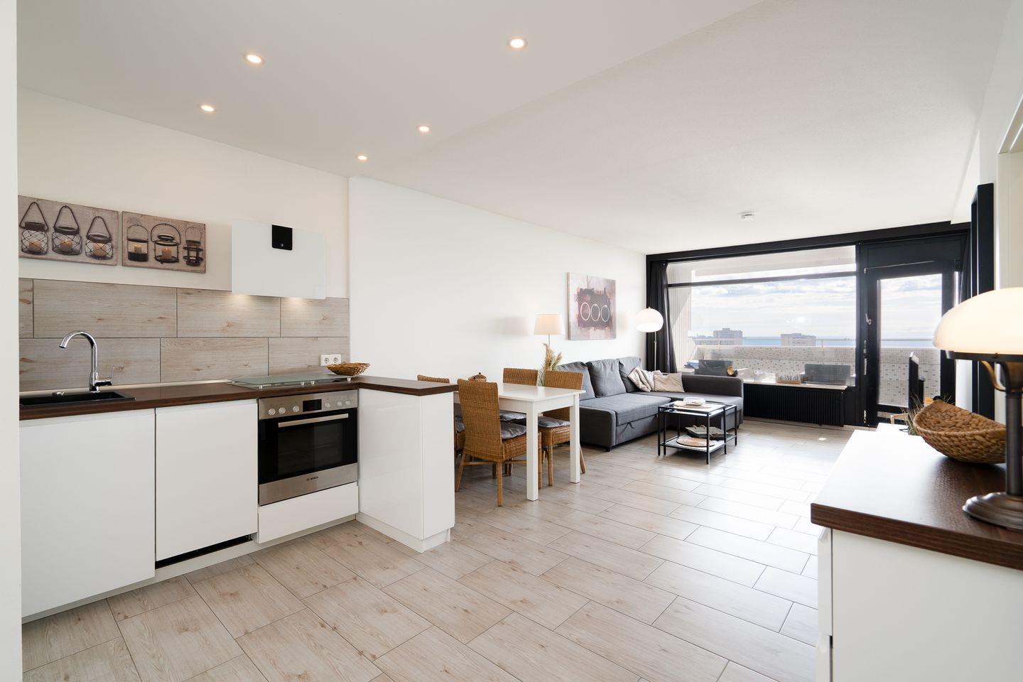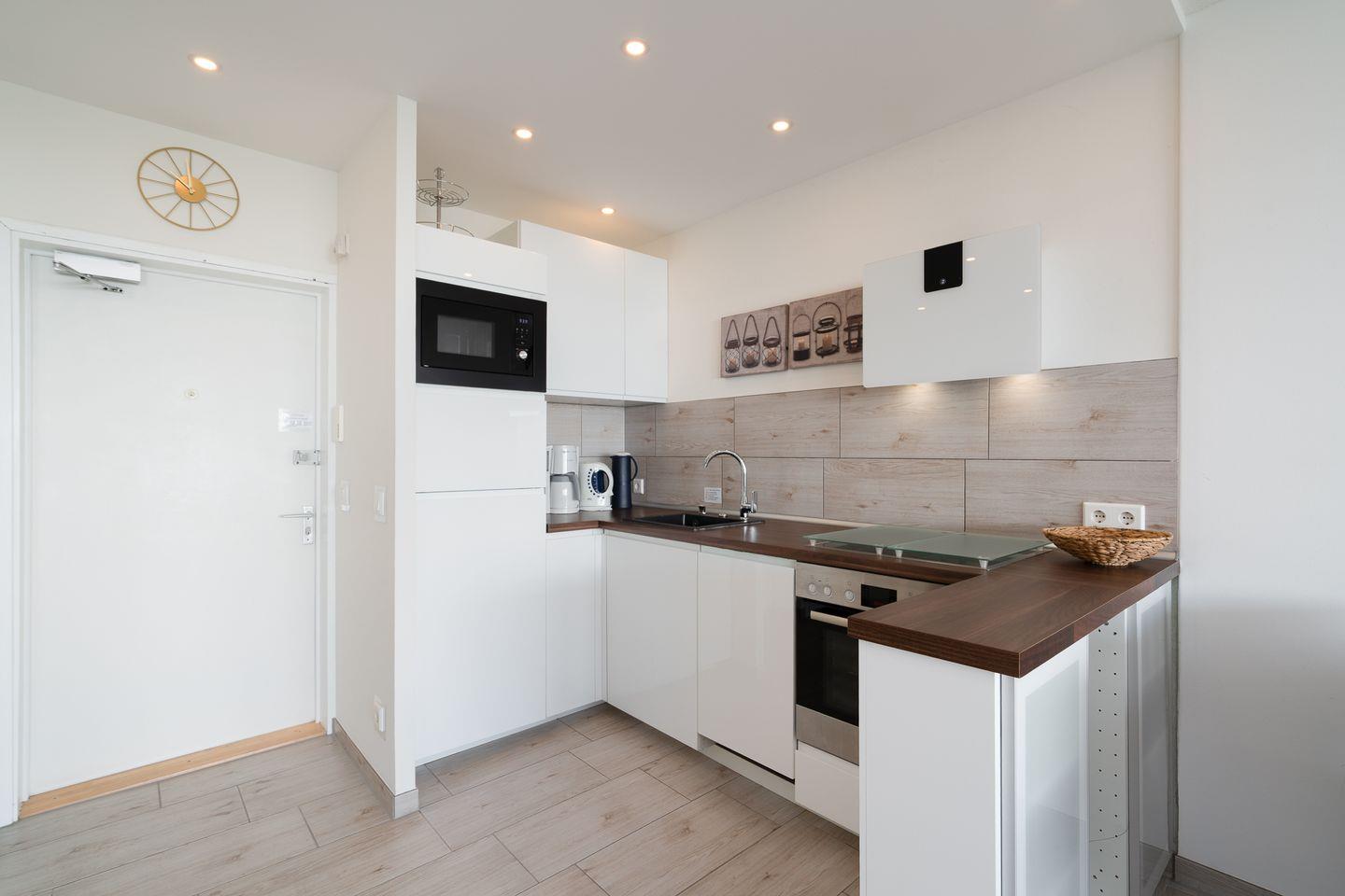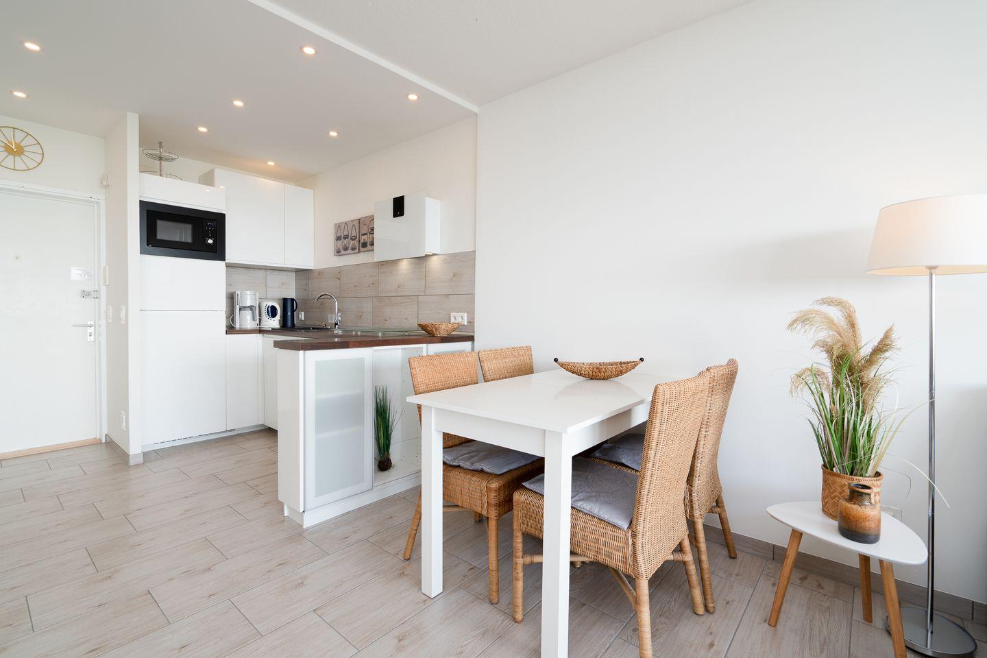 Unser Studio verfügt über einen großzügigen Wohn-/Schlafbereich mit offener Küche. Ein bequemes Doppelbett (140 cm x 200 cm) ist optisch durch eine halbhohe Wand vom Wohnbereich getrennt. Ein separates Schlafzimmer mit Etagenbett (2x 90 cm x 190 cm) ist für zwei weitere Personen eingerichtet. Der Wohnbereich lädt mit einer großen ausziehbaren Couch (140 cm x 200 cm) zum gemütlichen entspannen ein. Das moderne Bad ist mit einer Regendusche und niedrigem Einstieg sowie Handtuchheizkörper ausgestattet. Ein Vergrößerungsspiegel liegt für Sie bereit. Alle Räume bieten auch für einen längeren Aufenthalt großzügigen Stauraum. Die moderne Einbauküche verfügt über einen Kühlschrank mit großem Eisfach, Geschirrspüler, Mikrowelle, Backofen mit Ceranfeld, eine Filterkaffeemaschine, ein Mixer, Wasserkocher, Toaster und selbstverständlich ausreichend Geschirr.