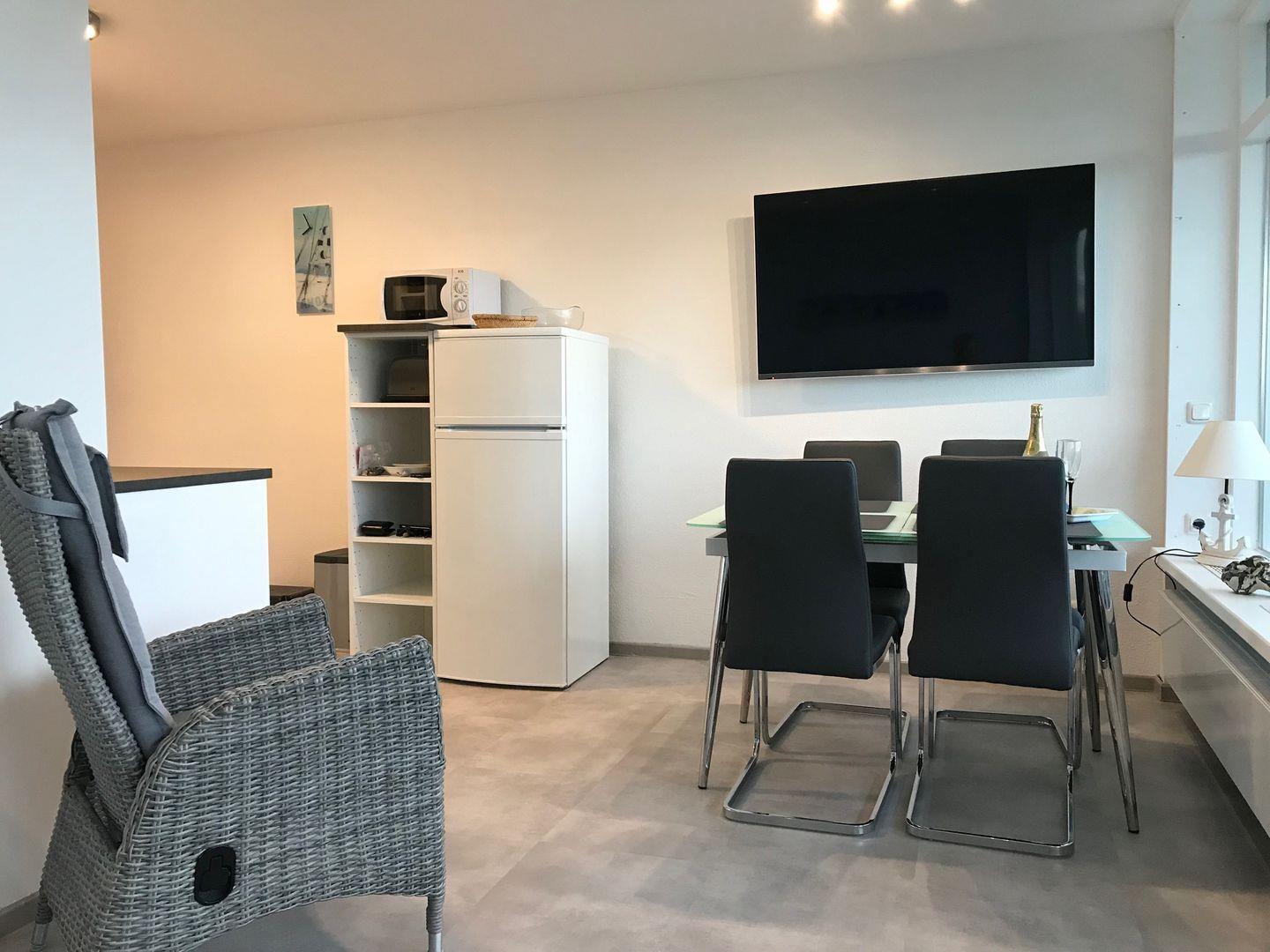 - im Wohnzimmer ausklappbares Sofa-Bett (160 cm breit), Esstisch mit 4 bequemen Stühlen und sehr großer Flat-TV (55 Zoll)