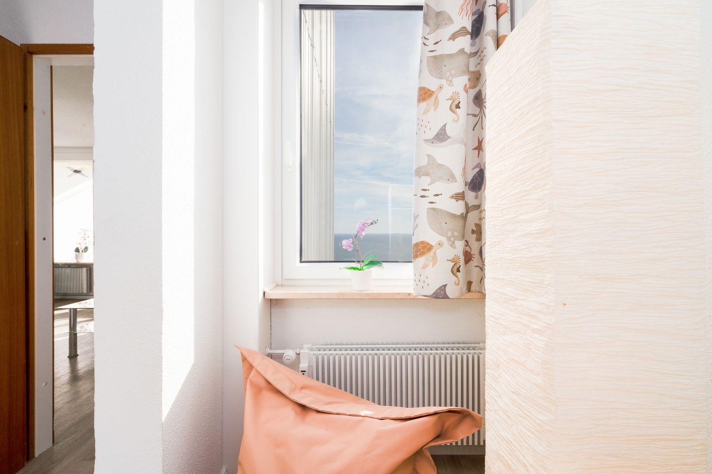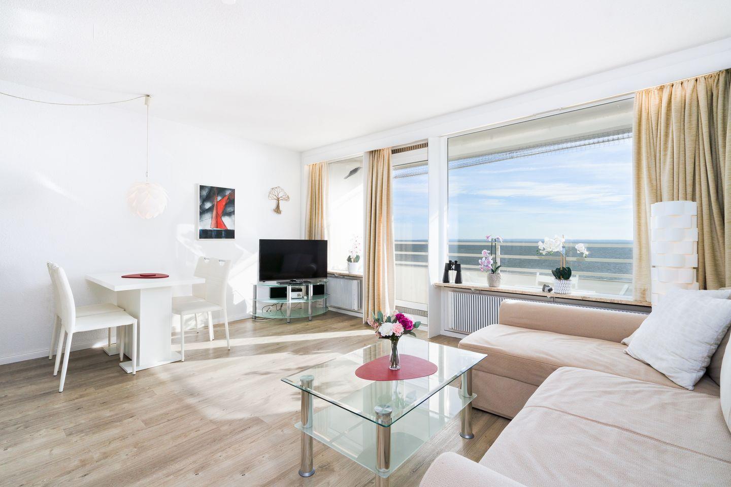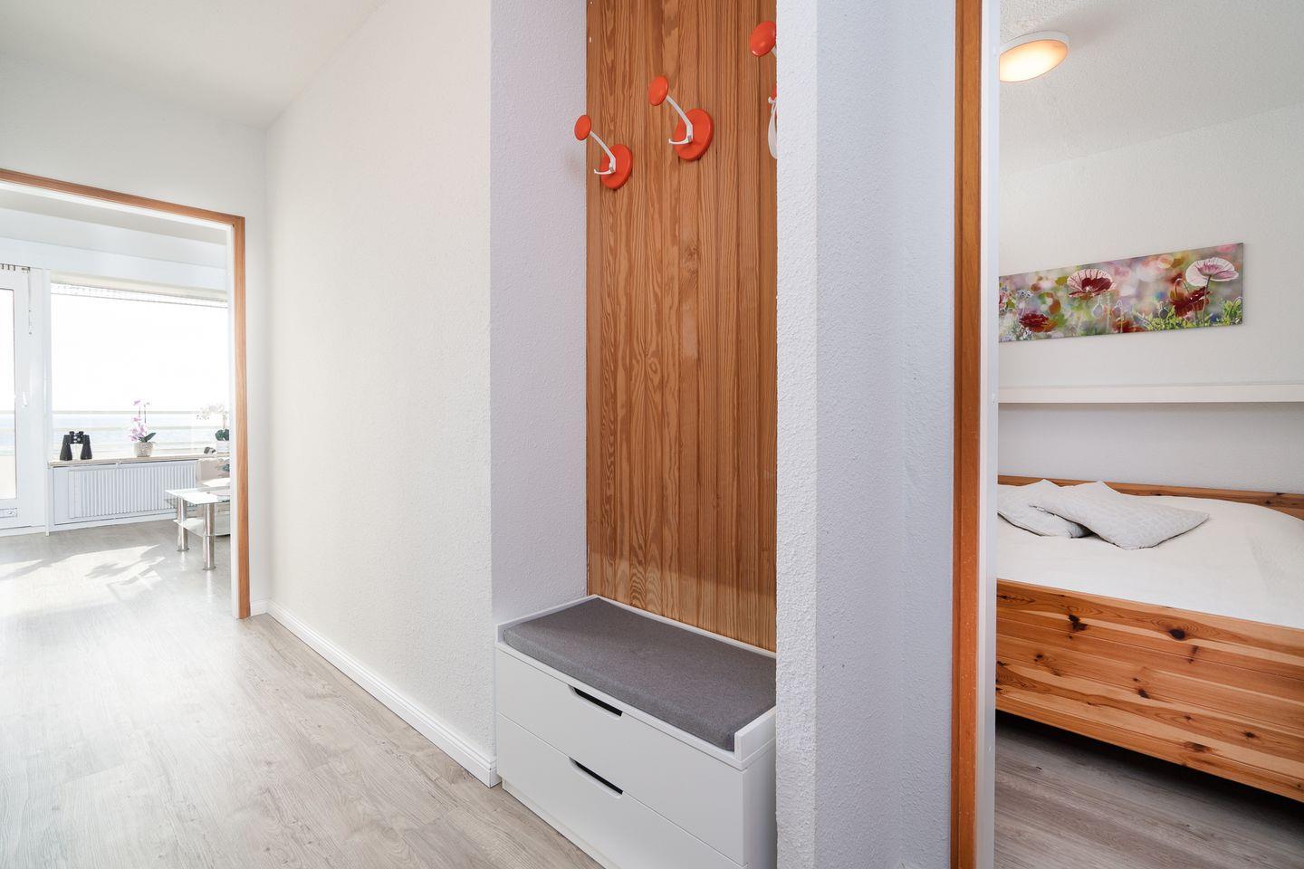 Die Ferienwohnung mit zwei Schlafzimmern ist ideal für Ihren entspannten Familienurlaub am Strand. Aus der 5. Etage aus haben Sie einen wunderschönen Blick auf die Lübecker Bucht. Die Küche mit Herd und Backofen ist mit einer Durchreiche zum Wohn-/Essbereich hin offen. Das erste Schlafzimmer hat ein Doppelbett, im zweiten steht ein Etagenbett. Das Wannenbad ist innenliegend. Zum Strand sind es nur wenige Gehminuten. WLAN inklusive.