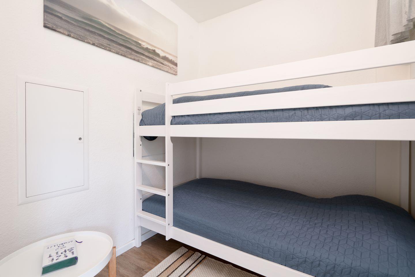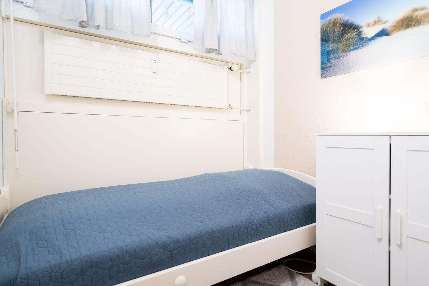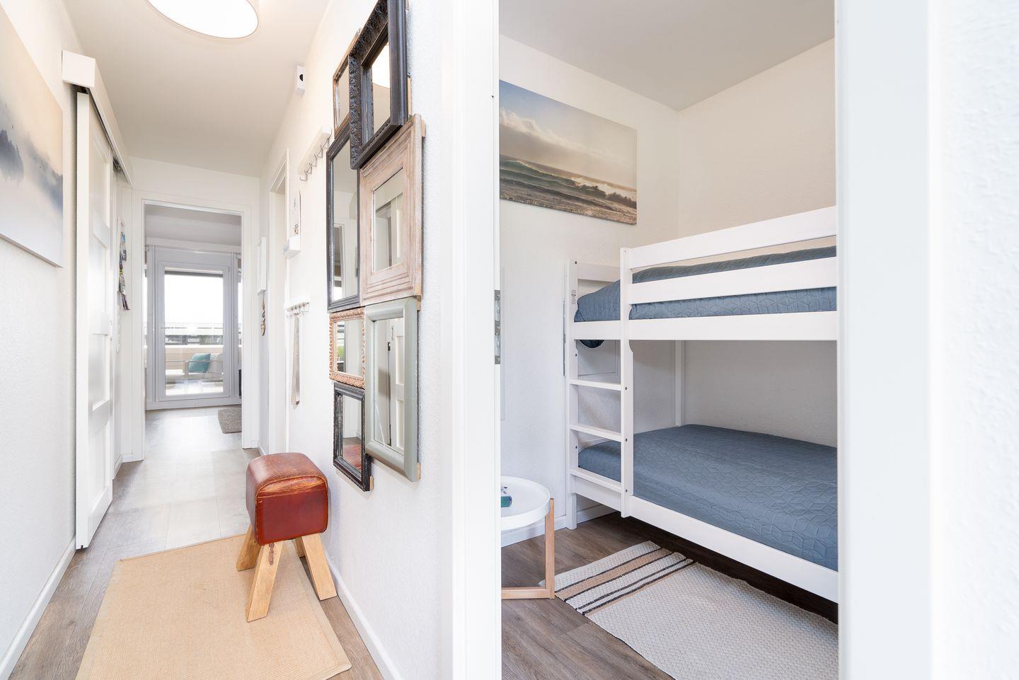 Die schöne 3-Raum-Ferienwohnung ist für 4 Personen geeignet. Der geräumige Wohn-/Essraum bietet eine gemütliche Sitzecke, sowie einen Esstisch. Von hier haben Sie auch Zugang zum Balkon mit Sitzgruppe und Strandkorb. Die mit Spülmaschine, Backofen und Herd ausgestattete Küche ist zum Wohn-/Essbereich hin offen. Im ersten Schlafraum stehen zwei Einzelbetten, im zweiten steht ein Etagenbett. Das moderne Duschbad ist innenliegend. Zum Strand sind es nur wenige Gehminuten. WLAN inklusive.