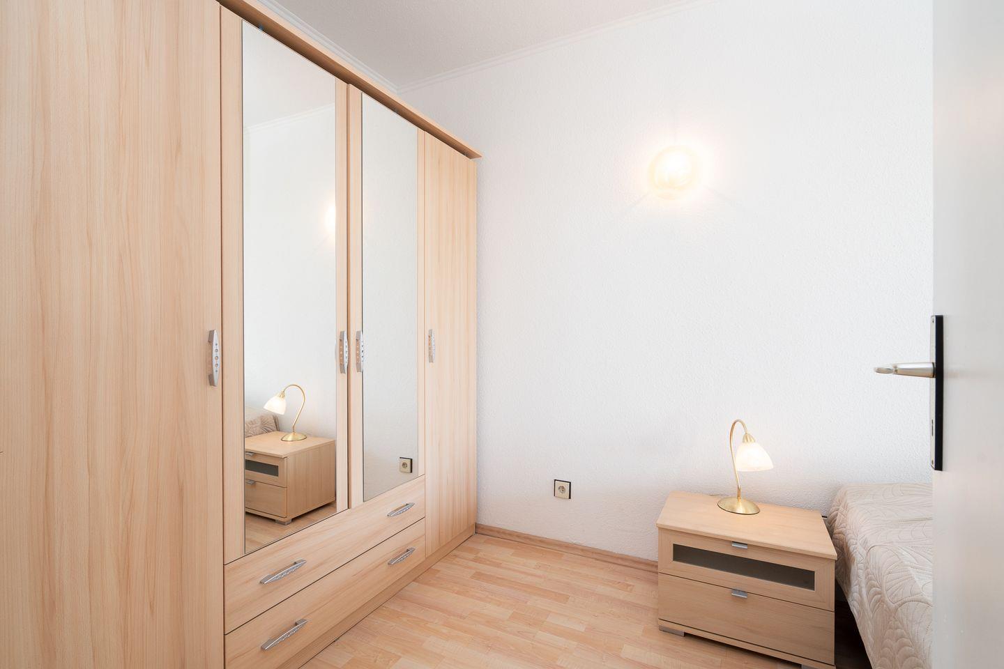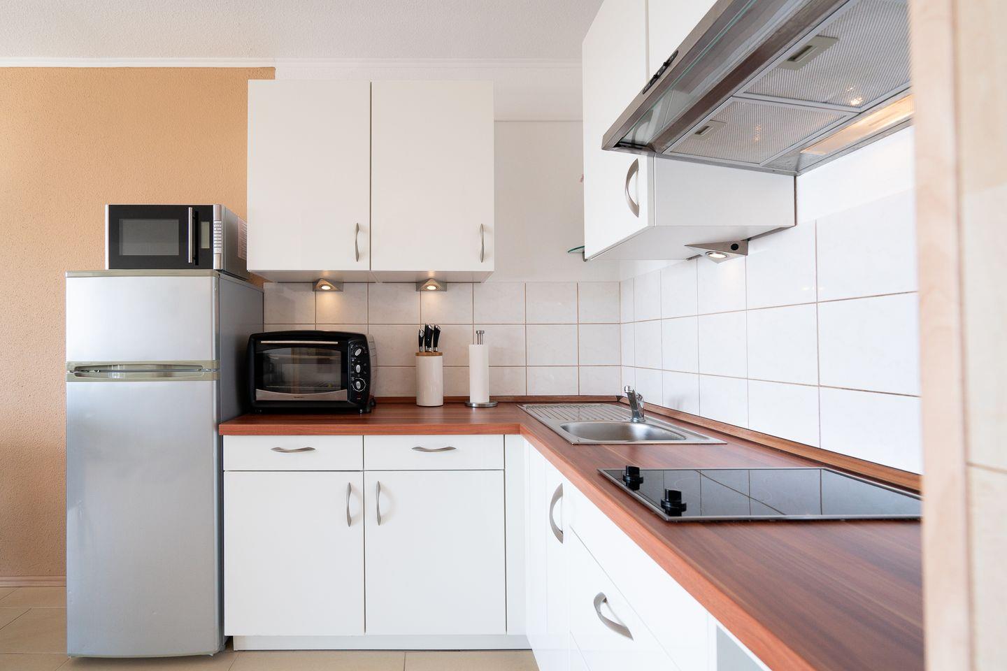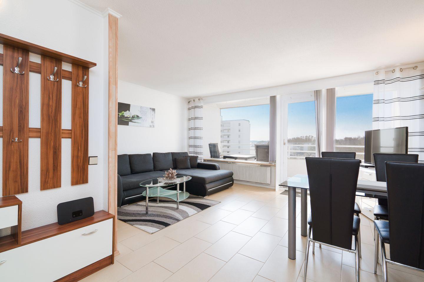 Die helle 1-Raum-Ferienwohnung liegt in der 4. Etage, vom Balkon blicken Sie über die Anlage hinweg in die Lübecker Bucht. Die Küche mit Backofen, Herd und Mikrowelle ist in den kombinierten Wohn- und Essbereich integriert. Der Schlafbereich mit Doppelbett (140 x 200 cm) lässt sich durch ein Schiebeelement vom Wohn- und Essbereich abtrennen. Im Wohnbereich steht zudem ein Schlafsofa (130 x 200 cm), so dass die Wohnung für vier Personen geeignet ist. Das hell geflieste Duschbad ist innenliegend. Zum Strand sind es nur wenige Fußschritte. PKW-Stellplatz inklusive.