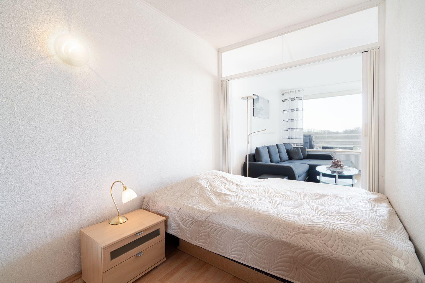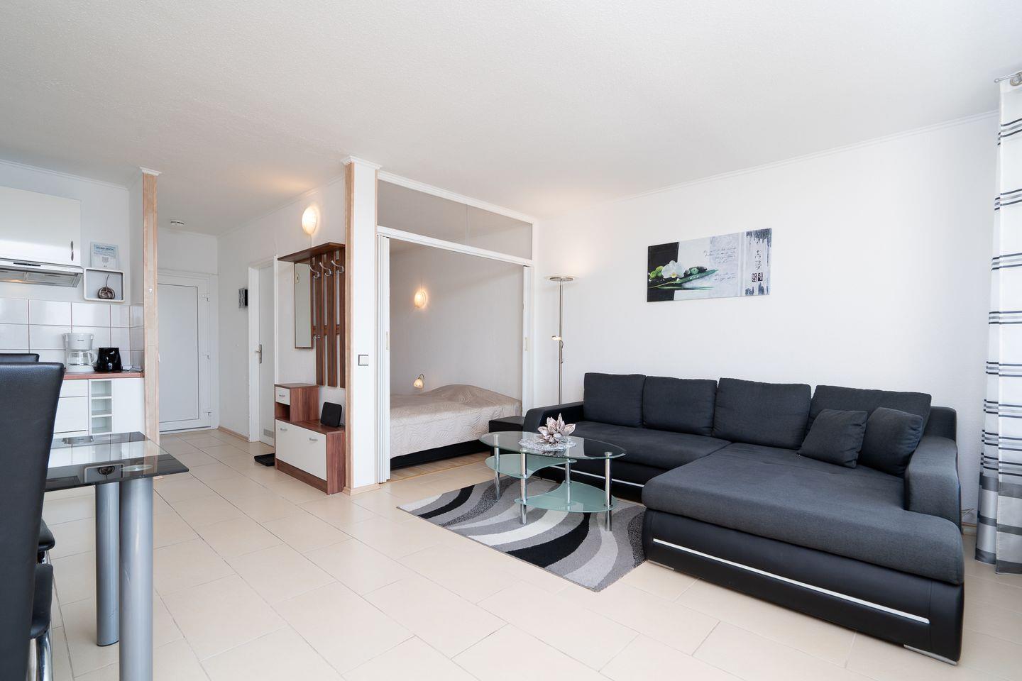Die helle 1-Raum-Ferienwohnung liegt in der 4. Etage, vom Balkon blicken Sie über die Anlage hinweg in die Lübecker Bucht. Die Küche mit Backofen, Herd und Mikrowelle ist in den kombinierten Wohn-/Essbereich integriert. Der Schlafbereich mit Doppelbett lässt sich durch ein Schiebeelement vom Wohnbereich abtrennen. Hier steht zudem ein Schlafsofa, so dass die Wohnung für 4 Personen geeignet ist. Das hell geflieste Duschbad ist innenliegend. Zum Strand sind es wenige Fußschritte. WLAN inklusive.