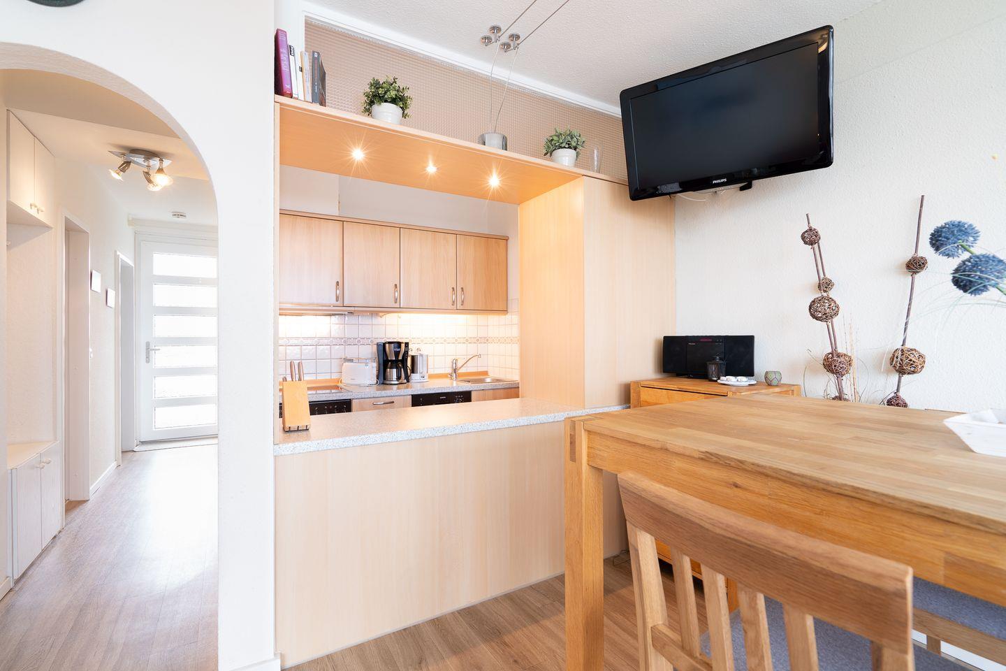 Die Wohnung befindet sich in der 2. Reihe der Terrassenhäuser in unmittelbarer Strandnähe und ist ideal für Ihren entspannten Strandurlaub mit der Familie. Über die 1. Reihe hinweg genießen Sie von der 3. Etage aus einen tollen Blick die Küste entlang über die Lübecker Bucht. Vom gemütlichen kombinierten Wohn- und Essbereich mit Esstisch und Sofaecke haben Sie Zugang zum Balkon in Süd-Ost-Lage. Die Küche ist mit Spülmaschine, Backofen und Herd ausgestattet und mit einer Durchreiche zum Essbereich hin offen. Im ersten Schlafraum steht ein Doppelbett (140 cm x 200 cm), im zweiten Schlafraum ein Etagenbett (jeweils 80 x 180 cm). Beide Schlafräume haben ein Fenster, das Duschbad ist hingegen innenliegend. Ohne eine Straße überqueren zu müssen, sind es nur wenige Gehminuten zum schönen Sandstrand. Der PKW Stellplatz befindet sich vor dem Haus.