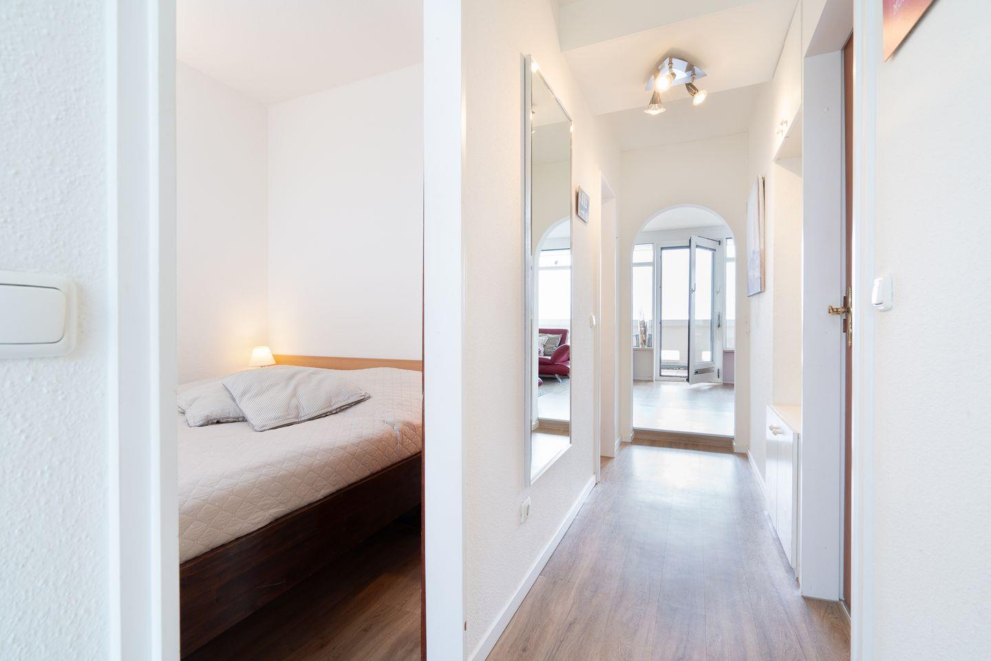 Herzlich Willkommen in der 3-Raum-Ferienwohnung Nr. 241! Die Wohnung befindet sich in der 2. Reihe der Terrassenhäuser. Über die 1. Reihe hinweg genießen Sie von der 3. Etage aus einen tollen Blick über die Lübecker Bucht. Vom Wohn-/Essbereich haben Sie Zugang zum Balkon. Die Küche mit Spülmaschine, Backofen und Herd ist mit einer Durchreiche zum Essbereich offen. Im 1. Schlafraum steht ein Doppelbett, im 2. ein Etagenbett. Das Duschbad ist innenliegend. Zum Strand sind es nur wenige Gehminuten.