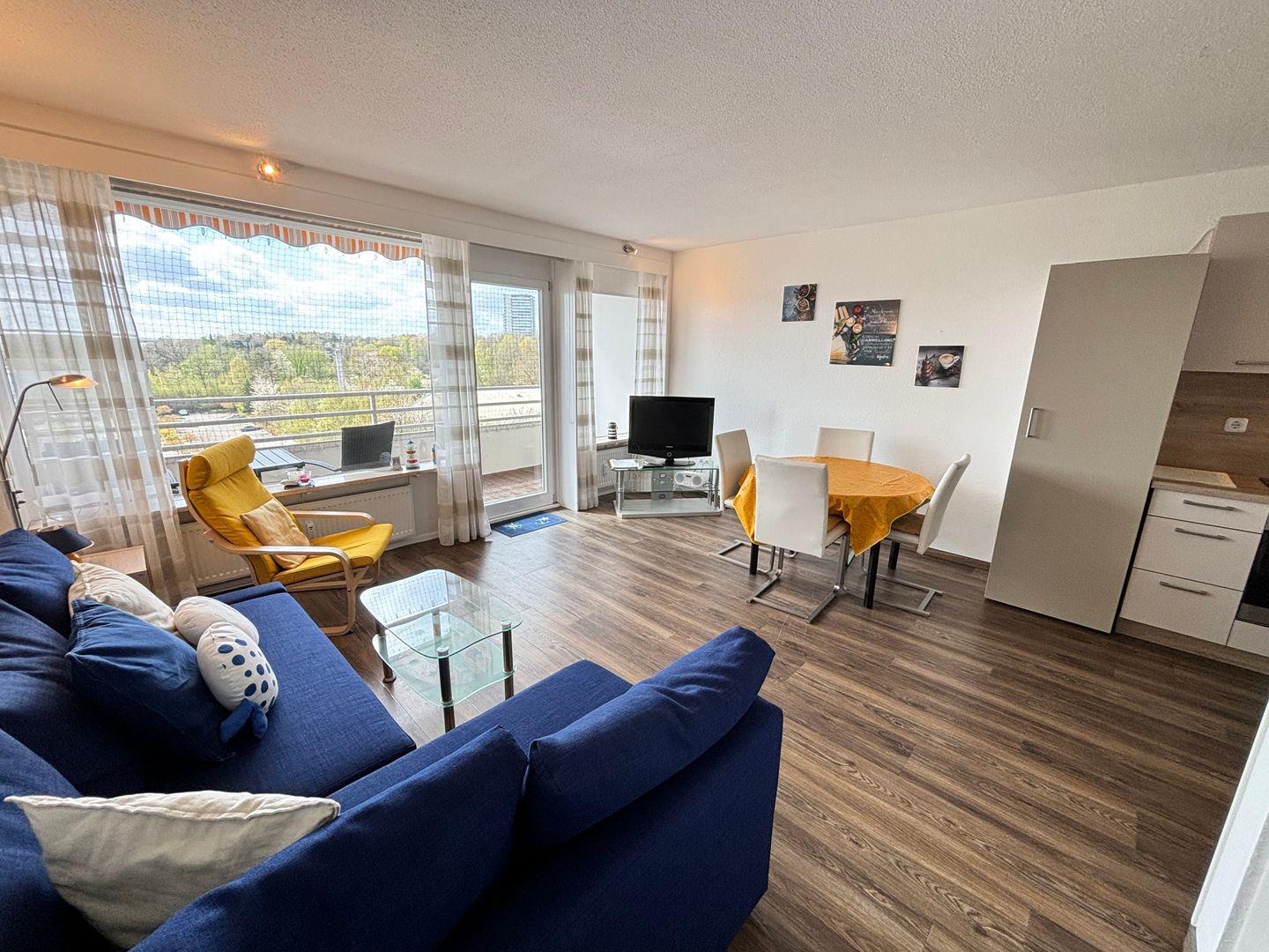 Diese schöne Wohnung liegt in der 7. Etage eines Hochhauses und ist für bis zu vier Personen geeignet. Vom Balkon aus haben Sie über die Häuser der Anlage hinweg Sicht auf die Ostsee und die Lübecker Bucht. Die Küche ist mit Backofen und Herd ausgestattet und in den kombinierten Wohn- und Essbereich integriert. Hier steht auch ein bequemes Schlafsofa (140 cm x 200 cm). Im Schlafraum stehen zwei Einzelbetten (je 90 cm x 190 cm), die man nicht zusammenstellen kann. Das hell geflieste Bad hat eine Dusche und ein Oberlicht zum Lüften. Ohne eine Straße überqueren zu müssen, sind es nur wenige Fußschritte. PKW-Stellplatz inklusive.