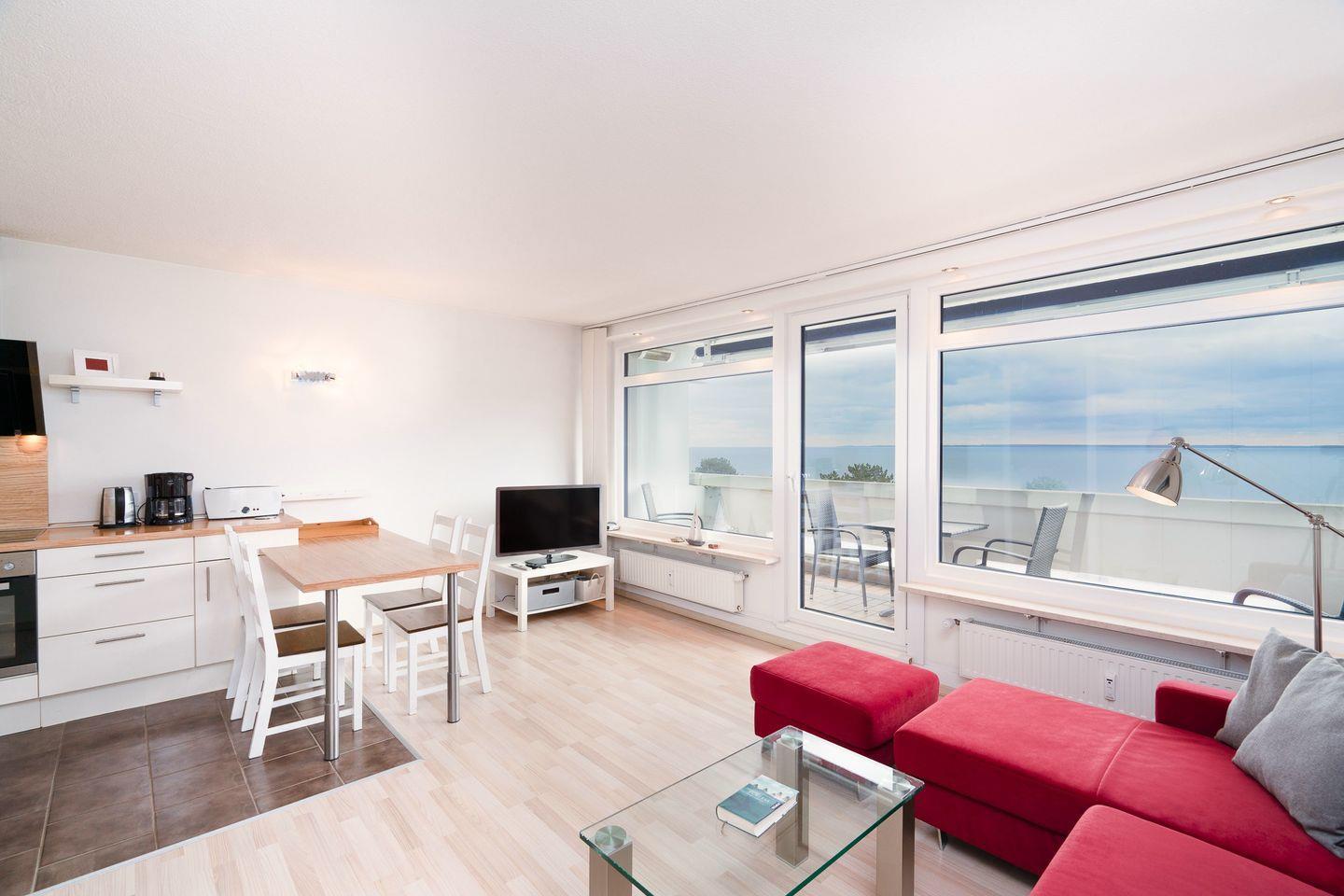 In dieser schönen und hellen Ferienwohnung kommen Sie sofort in Urlaubsstimmung! In der 2. Reihe der Terrassenhäuser gelegen, haben Sie von der 3. Etage aus einen wunderbaren Blick auf die Lübecker Bucht. Vom Wohn- und Essbereich mit integrierter Küche haben Sie Zugang zum Balkon. Die moderne Küche ist mit Spülmaschine, Backofen und Herd ausgestattet. Die Schlafräume sind einmal mit einem französischem Doppelbett (140 x 200) und einem ausziehbarem Einzelbett (2x 90 x 190 cm) ausgestattet. Das hell geflieste und moderne Bad ist innenliegend und hat eine Dusche. Ohne eine Straße überqueren zu müssen, sind es zum flach abfallenden Sandstrand nur wenige Fußschritte. PKW-Stellplatz inklusive.