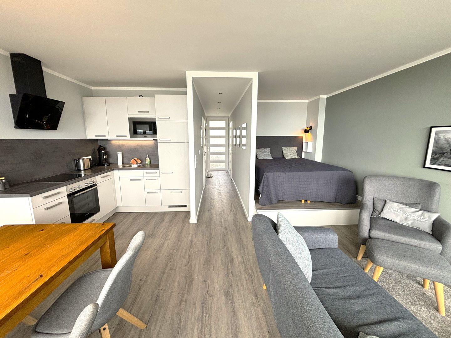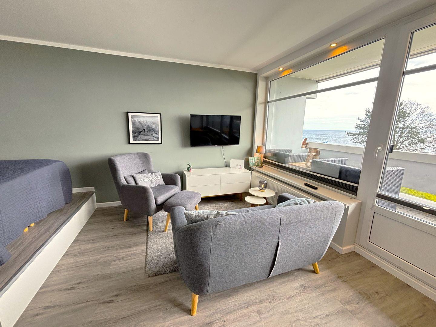 Die schöne 3-Raum-Wohnung Nr. 088 liegt in der 1. Reihe der Flachbauten und hat somit einen herrlichen Blick auf die Ostsee. Der gemütliche und stimmig eingerichtete Wohn- /Essbereich mit bequemen Doppelbett lädt zum entspannten Urlaub ein. Die offene Küche ist mit Spülmaschine, Backofen und Herd ausgestattet. Im Schlafzimmer stehen zwei Einzelbetten, Ankleidezimmer separat. Das hell geflieste Bad mit bodentiefer Dusche ist innenliegend. Zum Strand sind es nur wenige Fußschritte. WLAN inklusive.