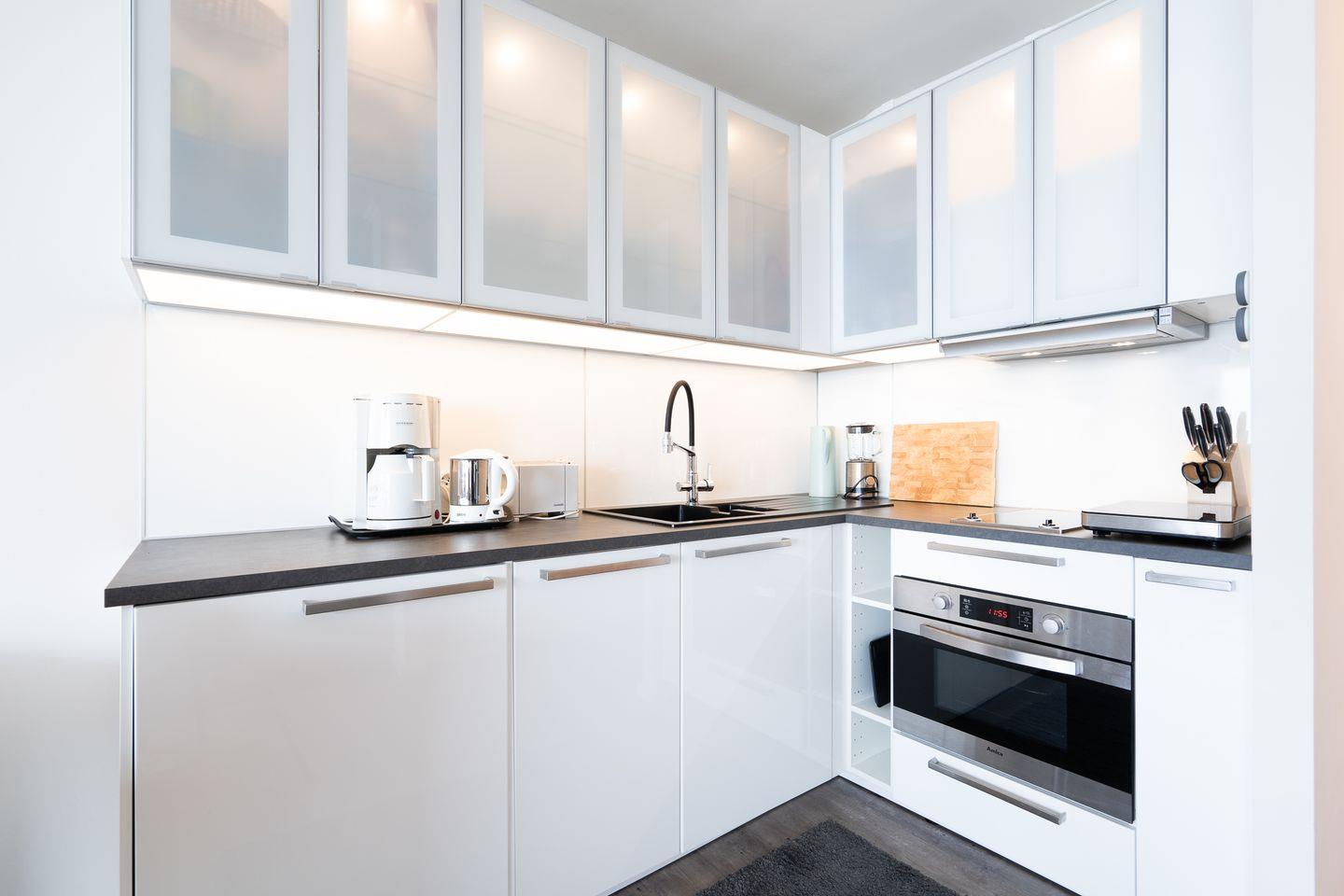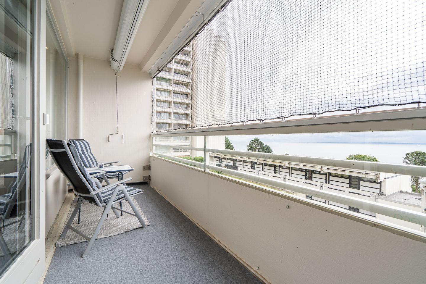 Die schöne und helle Ferienwohnung ist ein wunderbares Feriendomizil für zwei Personen. Der Balkon bietet über andere Häuser hinweg Blick auf die Ostsee. Das bequeme Doppelbett ist in den Wohn- und Essbereich integriert und ist von beiden Seiten zugänglich. Die moderne Küche ist mit einer Spülmaschine und einem Mikrowellen-Backofen-Kombigerät ausgestattet. Das Duschbad ist innenliegend. Zum flach abfallenden Sandstrand sind es nur wenige Fußschritte. WLAN inklusive.