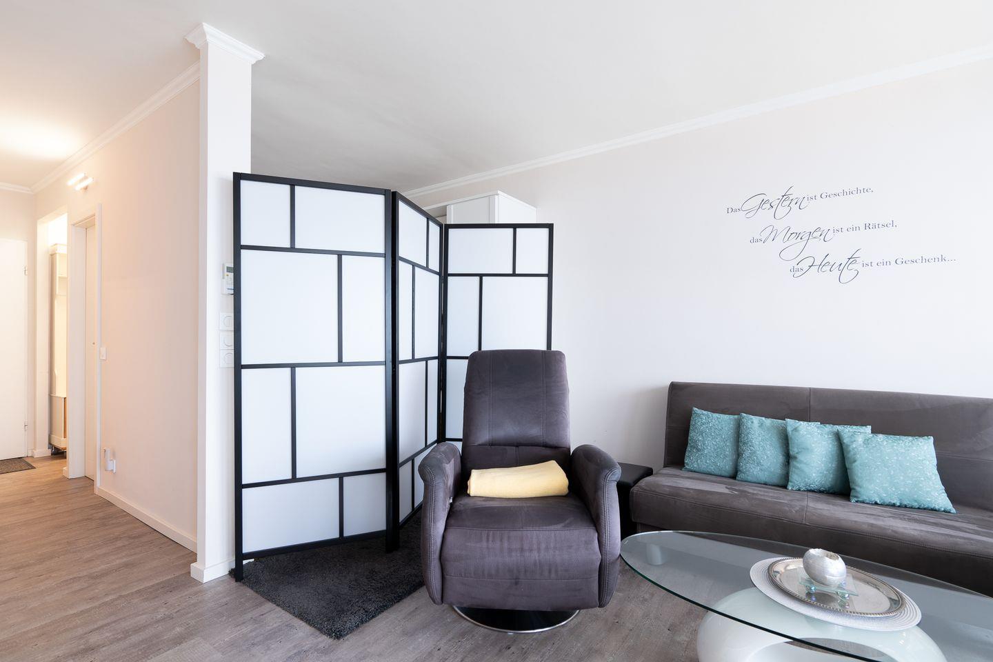 Diese schöne und helle Ferienwohnung ist ein wunderbares Feriendomizil für zwei Personen. Der Balkon bietet über andere Häuser hinweg Blick auf die Ostsee. Das bequeme Doppelbett (2x 90 cm x 200 cm) ist in den Wohn- und Essbereich integriert und ist von beiden Seiten zugänglich. Mit einem Raumteiler kann das Bett optisch vom Wohnbereich getrennt werden. Die offene und moderne Küche ist mit einer Spülmaschine und einem Mikrowellen-Backofen-Kombigerät voll ausgestattet. Die dort zubereiteten Mahlzeiten können Sie ganz bequem am Esstisch einnehmen und den Abend im Anschluss auf den komfortablen Sesseln ausklingen lassen. Das Duschbad ist innenliegend. Ohne eine Straße überqueren zu müssen, sind es zum flach abfallenden Sandstrand nur wenige Fußschritte. PKW-Stellplatz inklusive.