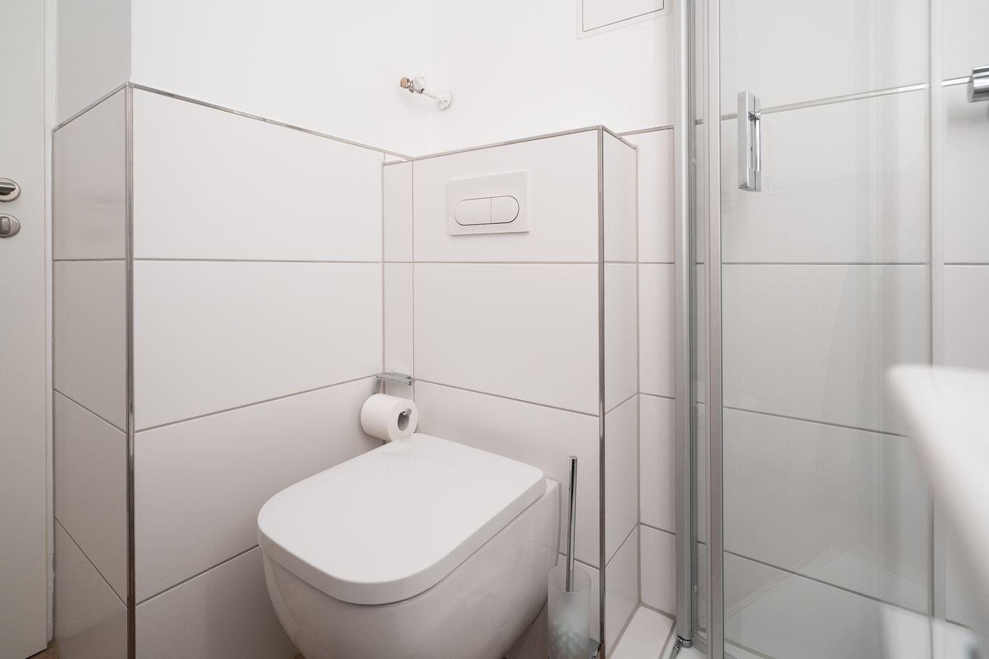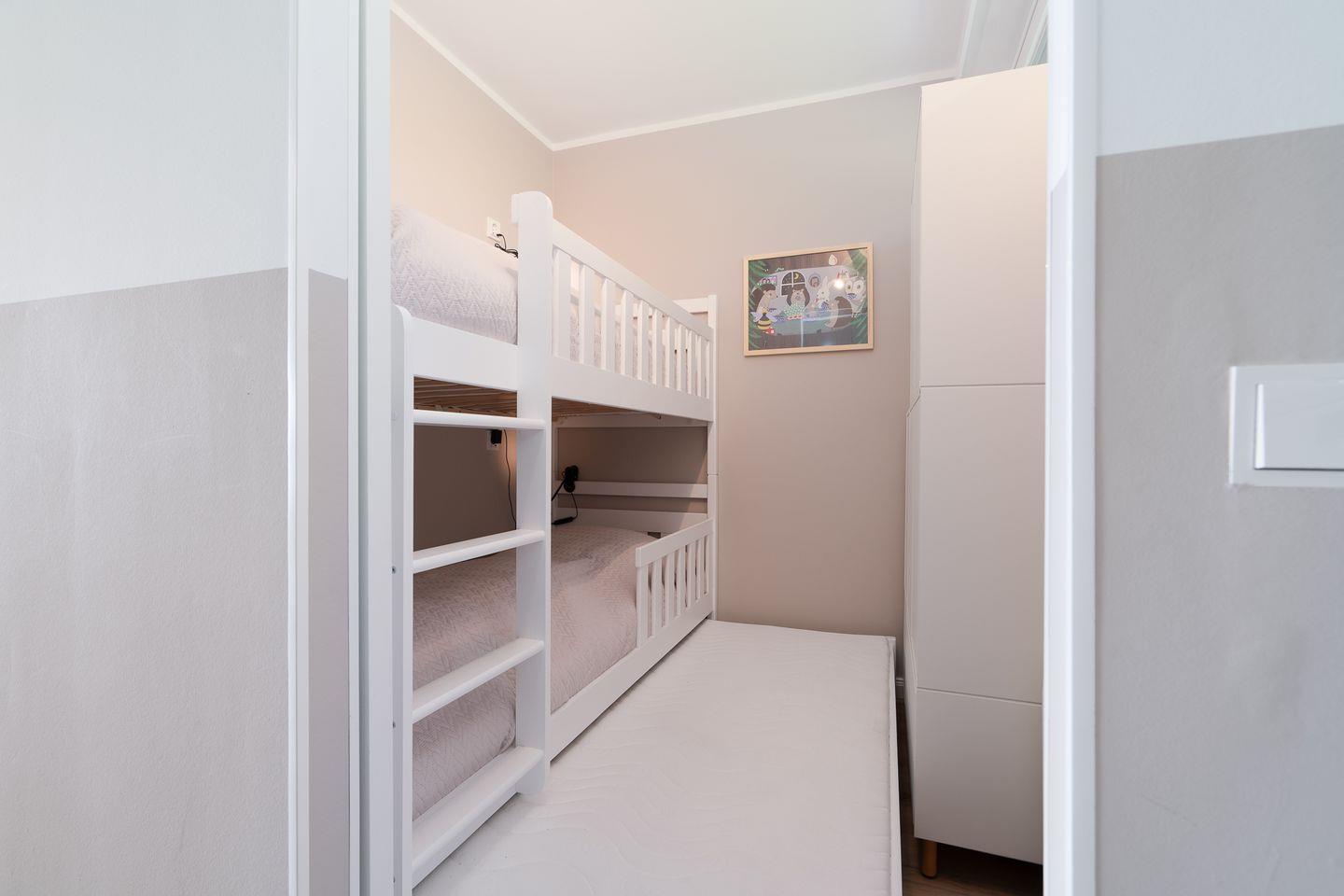 Das Apartment liegt im zweiten Stock einer gepflegten Ferienanlage und umfasst eine Wohnfläche von 50 m², aufgeteilt auf insgesamt drei Zimmer. Im ersten Schlafzimmer stehen zwei Einzelbetten (2x 90 cm x 190 cm), die nicht zusammengestellt werden können. Im zweiten Schlafraum steht ein Etagenbett (2x 90 cm x 180 cm). In den Schlafräumen befindet sich jeweils ein kleines Fenster zum Öffnen. Das neue Duschbad ist innenliegend.