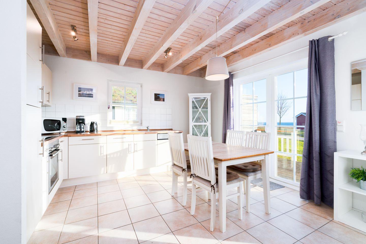 Unsere "Koggen" sind alleinstehende Häuschen mit zwei Terrassen, die ideal für Ihren Ostseeurlaub für bis zu 4 Personen sind. Im Erdgeschoss befinden sich die offene Küche mit Essbereich und der gemütliche Wohnbereich mit Kaminofen. Der Ofen sorgt für behagliche Stunden mit Freunden und Familie. Die Küche ist mit Spülmaschine, Backofen und Herd voll ausgestattet. Vom Essbereich haben Sie Zugang zur Terrasse, von der aus Sie einen wunderbaren Blick auf die Ostsee genießen können.