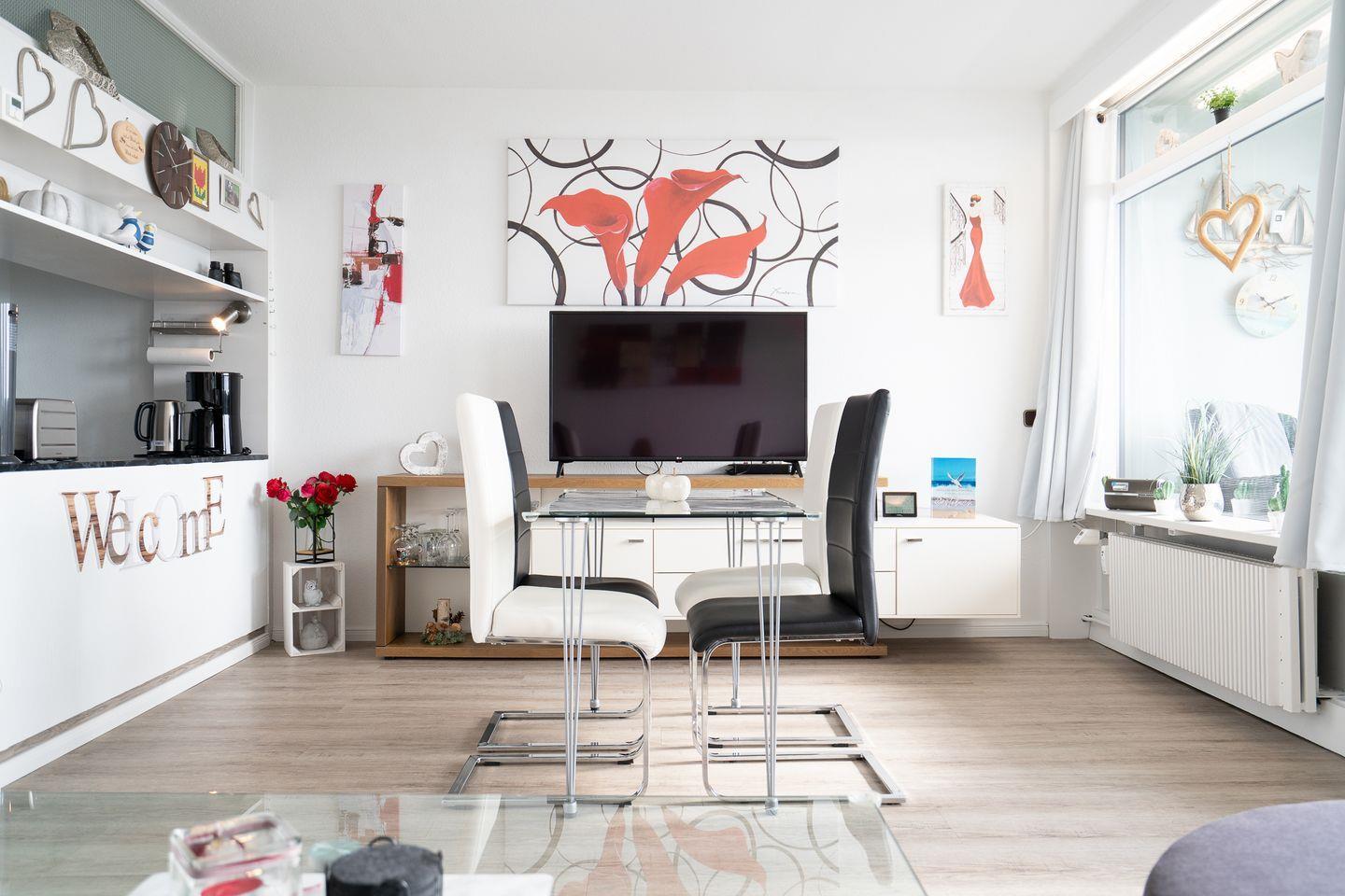 Die Gemütlichkeit der Ferienwohnung wird durch einen Wohnbereich komplettiert, der mit einem Sofa und einem modernen TV ausgestattet ist, sodass Sie sich nach einem erlebnisreichen Tag erholen können. WLAN steht Ihnen zur Verfügung, sodass Sie auch im Urlaub stets verbunden bleiben können. Darüber hinaus bietet die Unterkunft auch einen Essbereich und eine Sofaecke, die für gesellige Zusammenkünfte einladen.