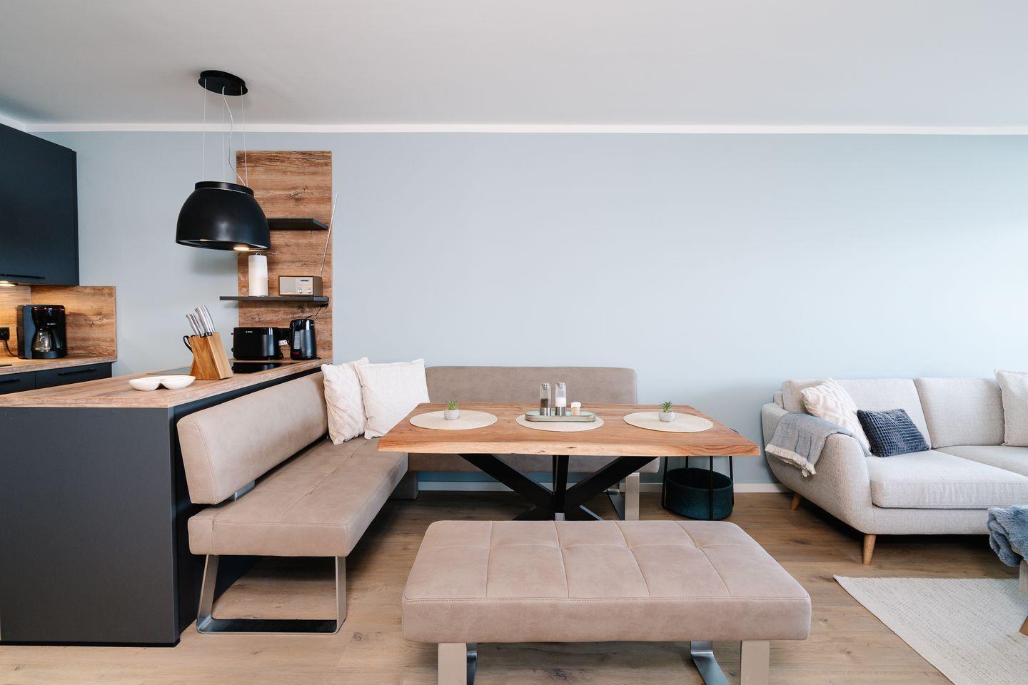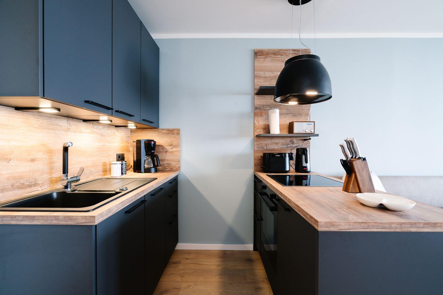 Die voll ausgestattete Küche überzeugt mit allem was man zur Selbstverpflegung braucht, wie Kühlschrank mit separatem Gefrierfach, Spülmaschine, Cerankochfeld, Backofen, Kaffeemaschine, Toaster und Wasserkocher.