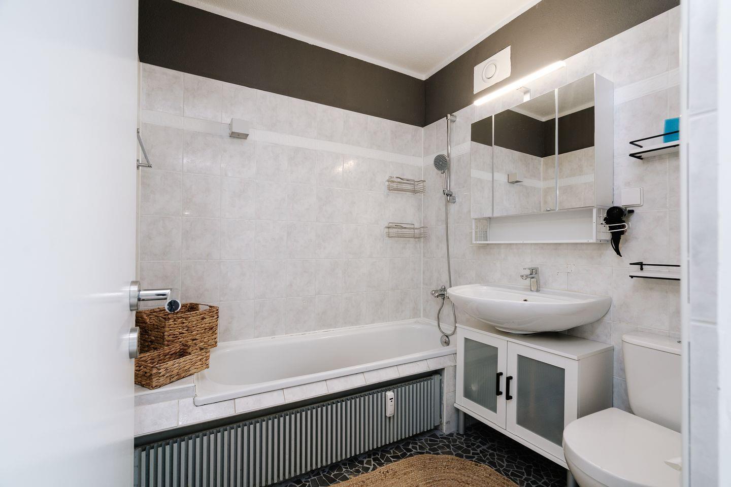 Das innenliegende Badezimmer ist mit Badewanne, Spiegelschrank, Föhn, Waschbecken und WC ausgestattet und lässt somit keine Wünsche offen.