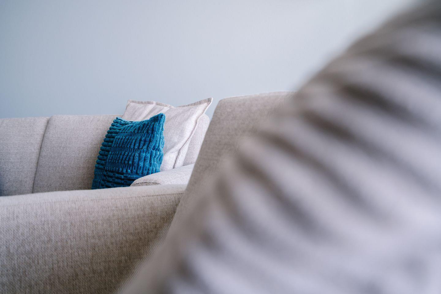 Der Wohnbereich ist durch die große Fensterfront sehr hell und bietet eine gemütliche Couch mit Blick auf den Smart TV für entspannte Fernsehabende.
