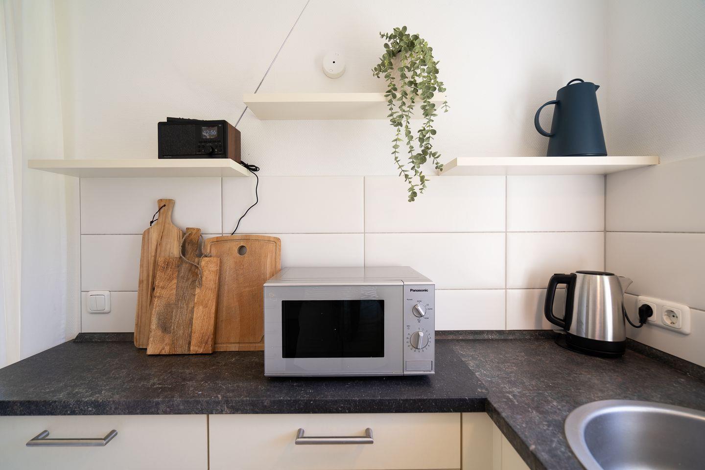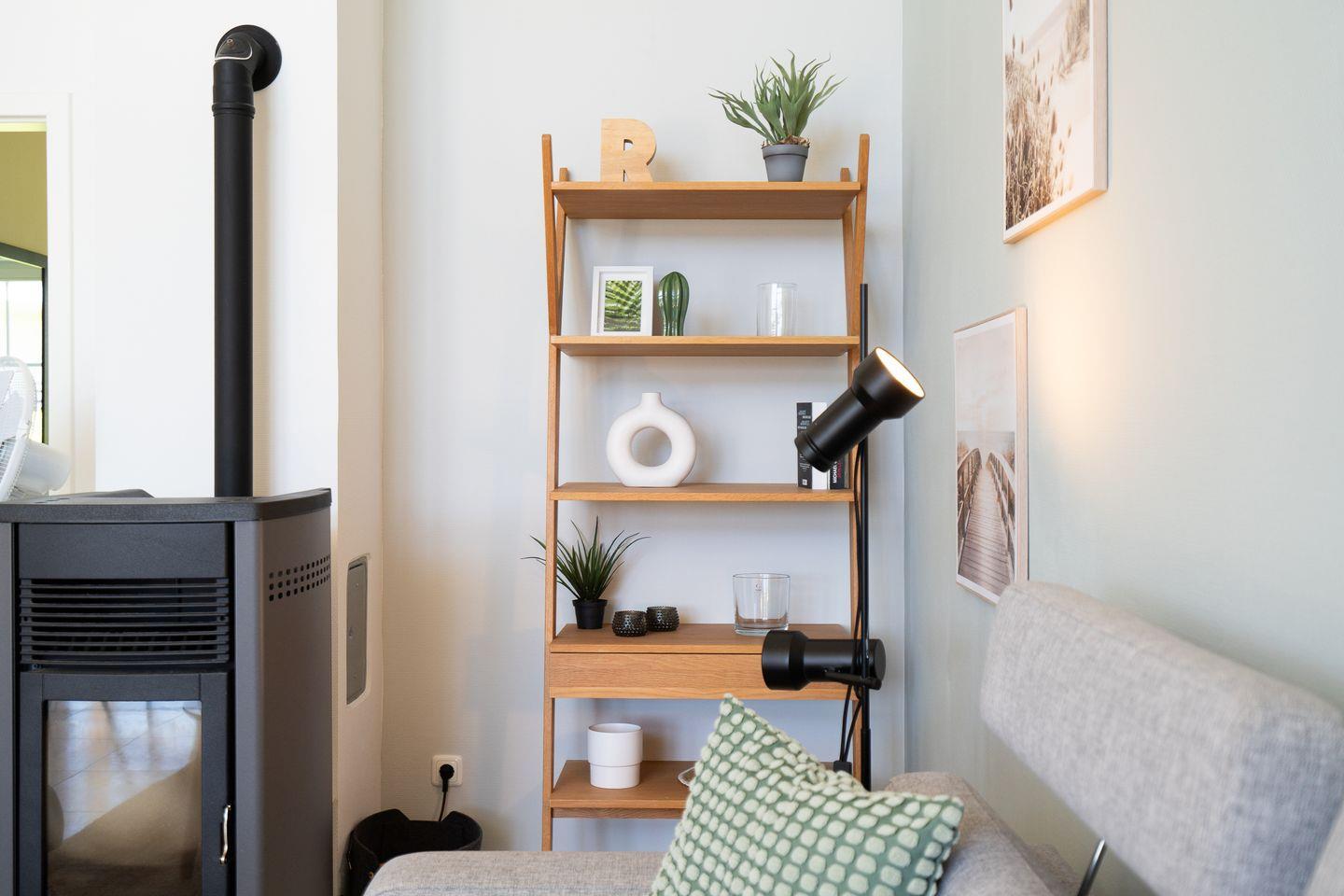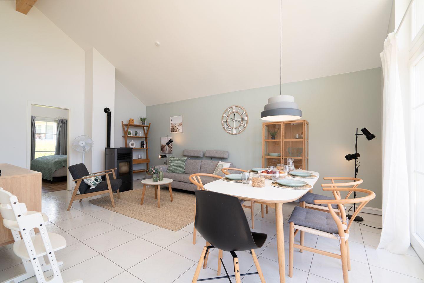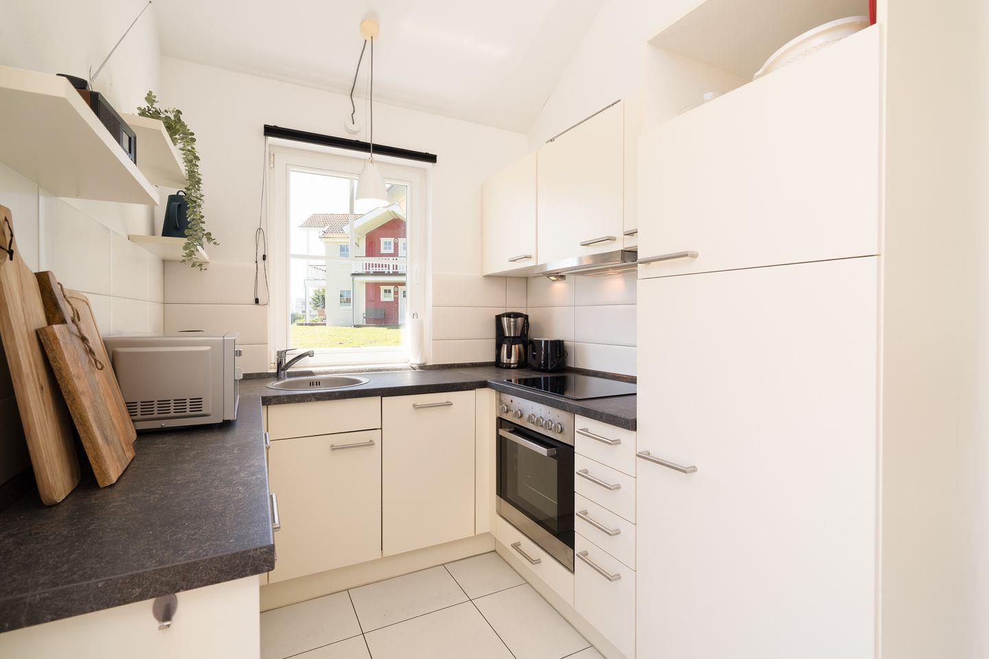 Der offene Wohnraum schafft mit gemütlicher Sofaecke und einem Ofen eine behagliche Atmosphäre, in der auch an kühleren Abenden Wohlbefinden garantiert ist. Die offene Küche ist voll ausgestattet: Sie verfügt über einen Ceranherd, Backofen, Kühlschrank mit Gefrierfach, Spülmaschine, Mikrowelle, Kaffeemaschine, Toaster, Wasserkocher, umfangreiche Küchenutensilien und Geschirr. Ein Essbereich mit großem Esstisch lädt zu gemeinsamen Mahlzeiten ein.