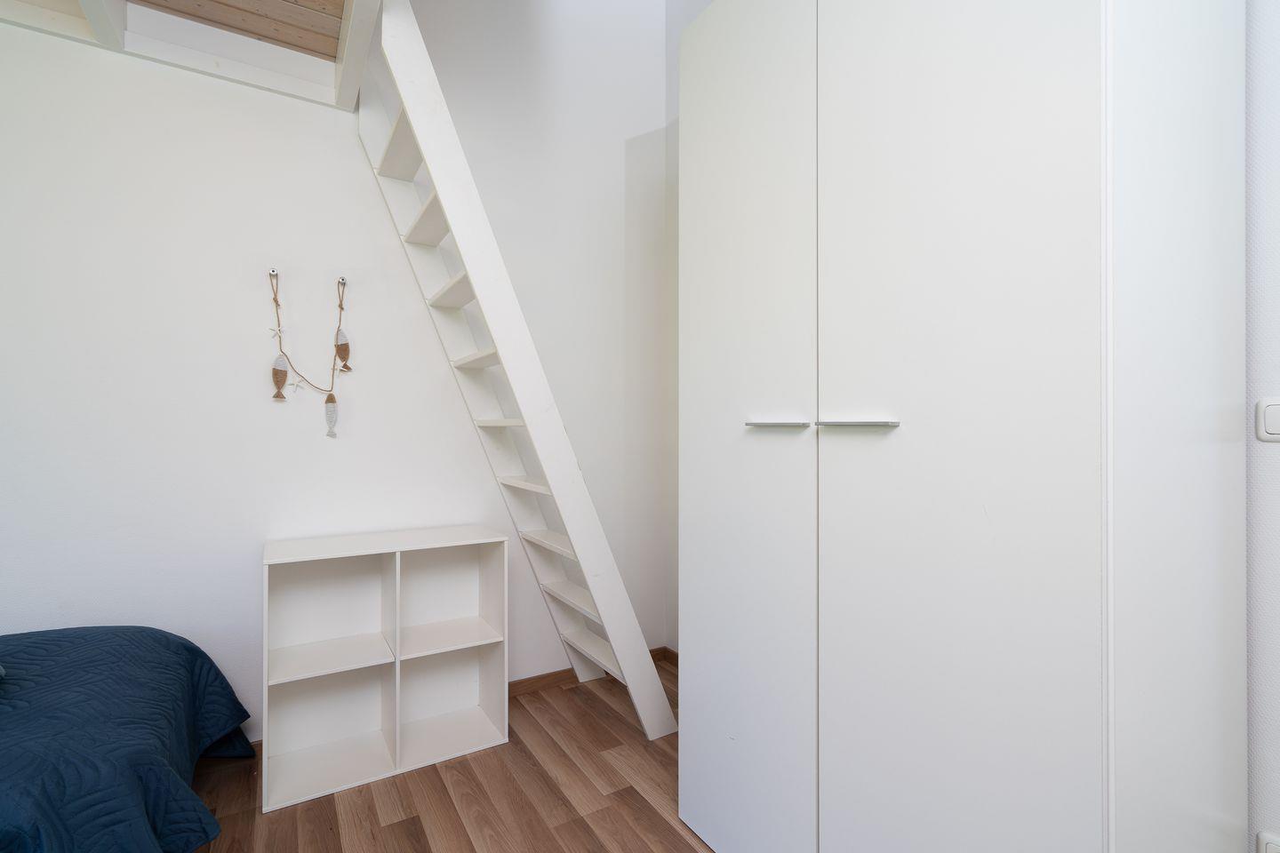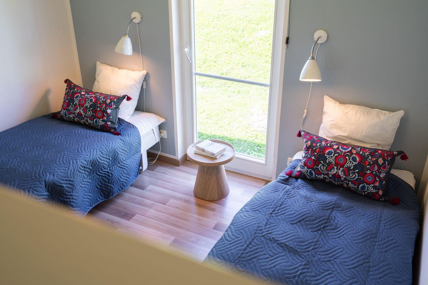 Im Inneren erwarten Sie drei gut geschnittene Zimmer mit 5 Schlafplätzen, darunter zwei separate Schlafzimmer und ein großzügiger Wohn- und Essbereich. Im ersten Schlafzimmer steht ein bequemes Doppelbett (2x 90 x 200 cm). Im zweiten Schlafzimmer stehen jeweils Einzelbetten (je 80 x 200 cm). Highlight des Zimmers ist der Schlafalkoven, zu dem Sie über eine schmale Treppe gelangen. Für den Komfort der kleinen Gäste stehen ein Babybett und ein Hochstuhl zur Verfügung. Sämtliche Fenster sind mit Sichtschutz versehen, sodass Sie jederzeit Privatsphäre und ein angenehmes Wohnklima genießen.