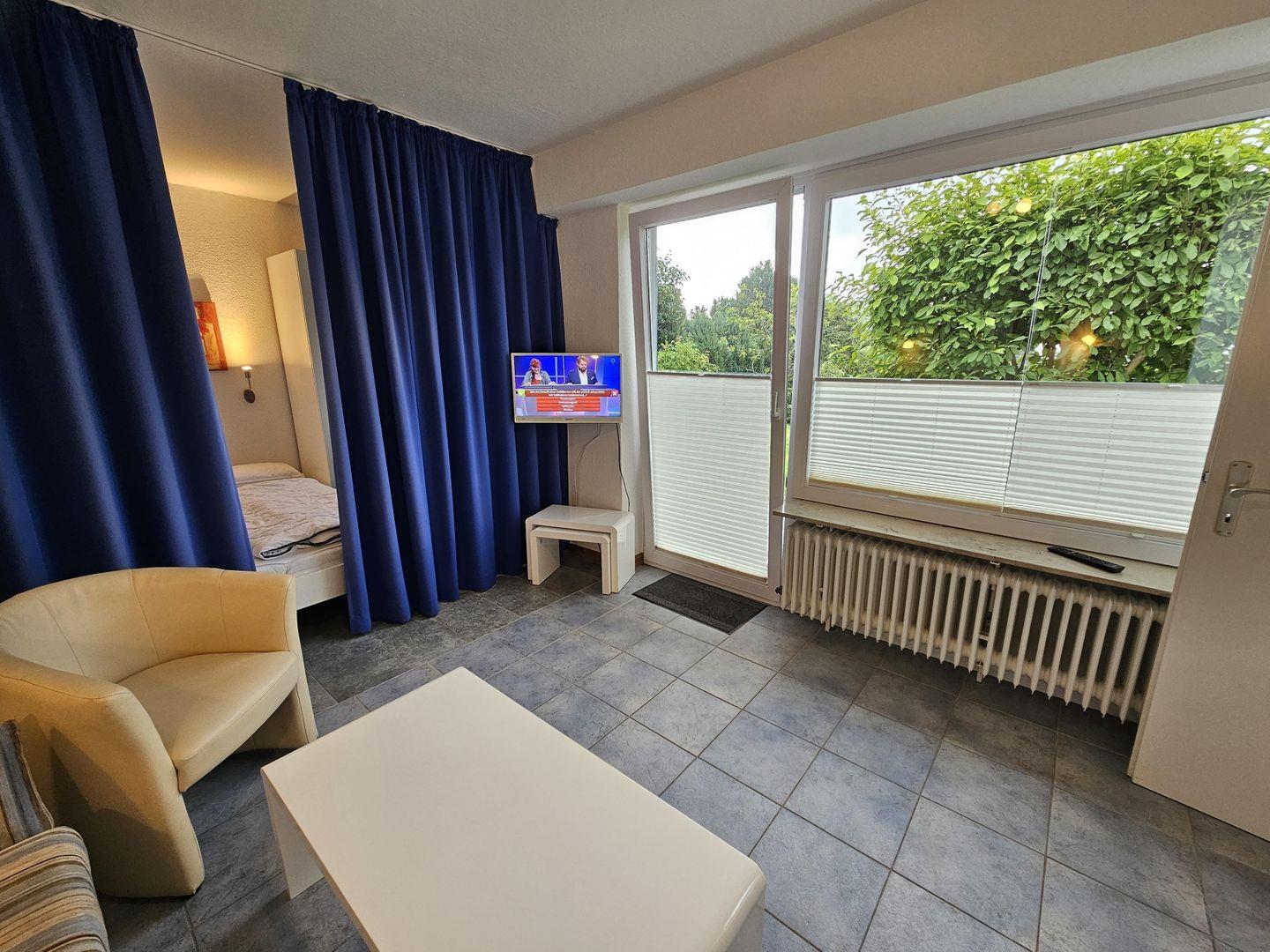 Einfach eingerichtetes 1-Zimmer-Appartement für 2 Personen nur ca. 100 Meter vom Strand mit Teilmeerblick.