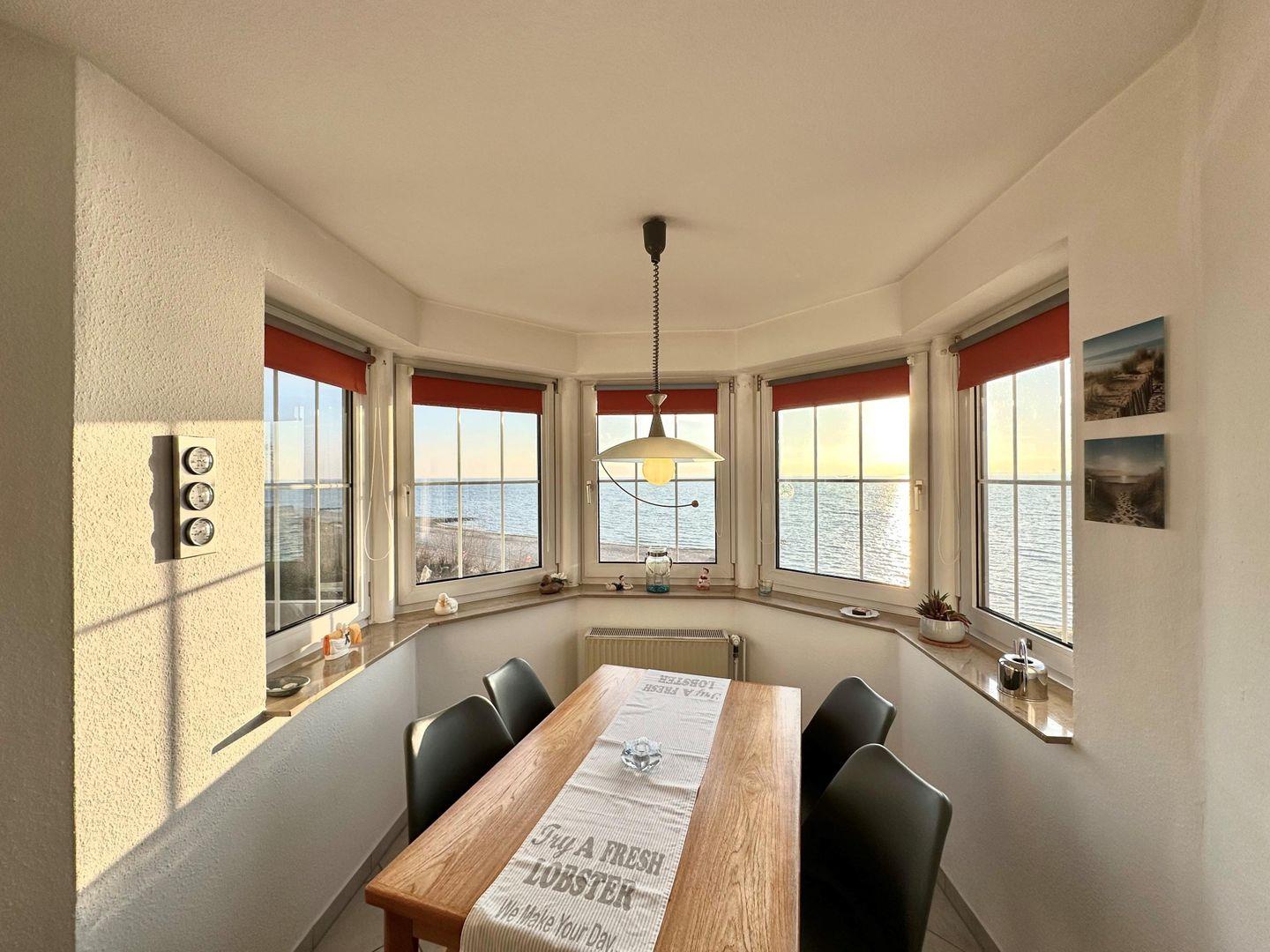 Die Wohnung ist 49 m² groß und befindet im zweiten Stock. Sie verfügt über einen großen Balkon, von dem Sie wunderbar den Sonnenaufgang mit einer Tasse Kaffee beobachten können. Nicht nur von dort haben Sie einen einzigartigen Blick aufs Meer, sondern auch aus dem Erker. Hier können Sie bis zur Hafeneinfahrt nach Travemünde schauen,