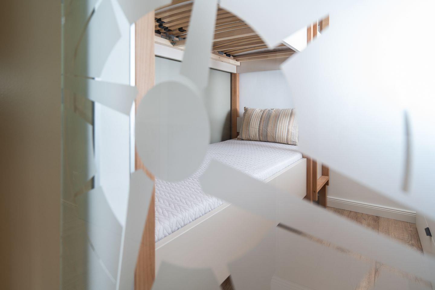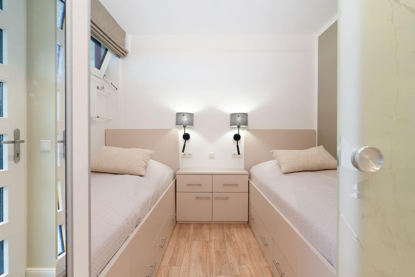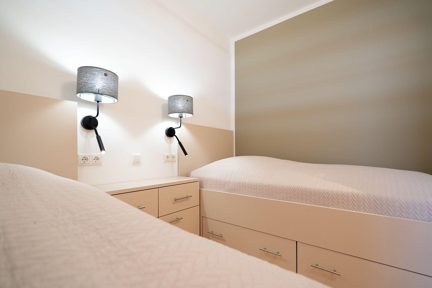 Das 48 m² große Apartment hat zwei separate Schlafzimmer und bietet insgesamt vier Schlafmöglichkeiten, und ist somit ideal für den Familienurlaub. Im ersten Schlafzimmer stehen zwei Einzelbetten (jeweils 90 x 190 cm), im zweiten Schlafzimmer steht ein Etagenbett (jeweils 80 x 190 cm). Das modern gestaltete Wohnzimmer verfügt über eine gemütliche Sofaecke, einen großen Flachbildfernseher sowie kostenloses WLAN und lädt zum Entspannen nach einem erlebnisreichen Tag ein. Der Essbereich verbindet den Wohnraum offen mit der vollständig ausgestatteten Küche, die Ihnen alles bietet, was Sie für eine komfortable Selbstversorgung benötigen. Das moderne, innenliegende Bad verfügt über eine bodentiefe Dusche.