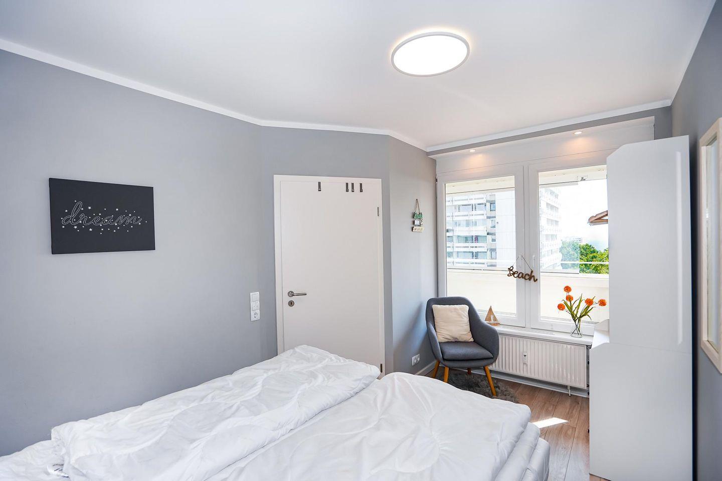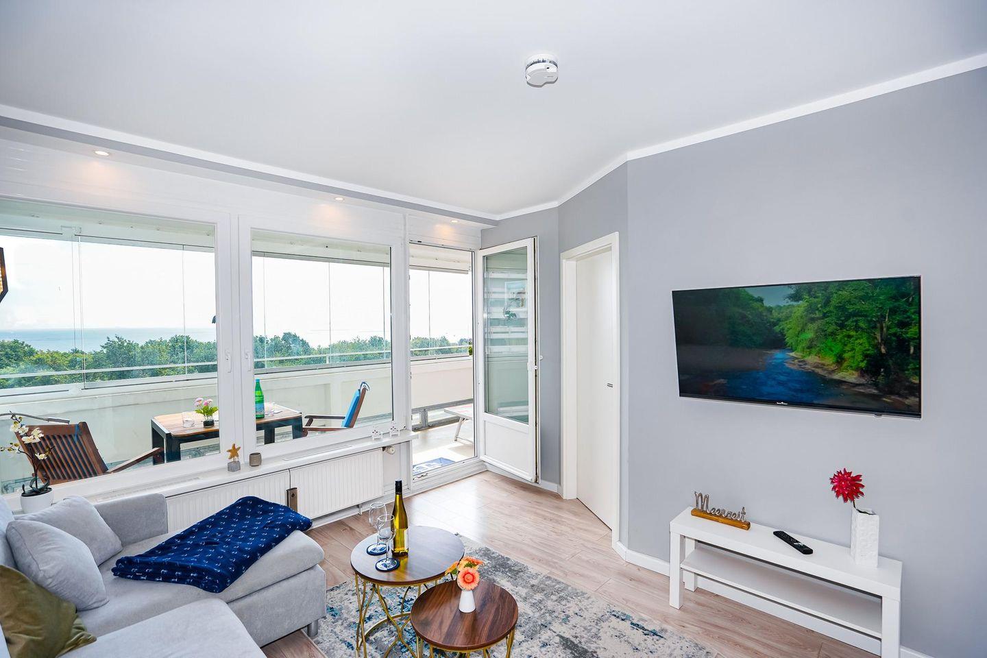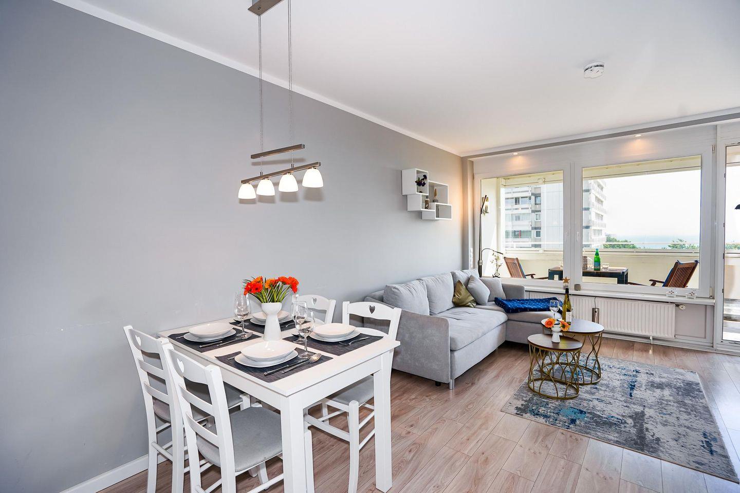 Das gepflegte und ruhig gelegene Apartment hat eine Größe von etwa 40 Quadratmetern und bietet bis zu 4 Urlaubsgästen Platz. Der Wohnraum verfügt über einen Essbereich sowie über eine bequeme Polsterlandschaft, von der aus die Lieblingsserie auf einem großen Flachbildfernseher verfolgt werden. Das helle Schlafzimmer ist mit einem bequemen Doppelbett (2 x 80 x200) ausgestattet. Die moderne Küche gibt Gelegenheit, eigene Mahlzeiten zuzubereiten. Das Badezimmer ist mit einer Dusche ausgestattet. Der mit wetterfesten Gartenmöbeln versehene Balkon bietet neben der Möglichkeit im Freien zu Frühstücken auch eine Aussicht auf die Lübecker Bucht. Eine Balkonverglasung lädt auch im Winter zum verweilen auf dem Balkon ein.
