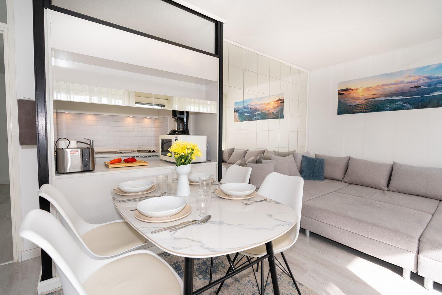Der offene Küchenbereich ist mit einem 2-Platten-Herd, Kühlschrank mit Gefrierfach, Mikrowelle, Wasserkocher, Kaffeemaschine, Küchenutensilien sowie Geschirr und Besteck vollständig ausgestattet und erlaubt die unkomplizierte Zubereitung aller Mahlzeiten. Ein integrierter Esstisch sorgt für gesellige Stunden. Im Wohnzimmer laden ein bequemes Sofa und zwei Fernseher zum Entspannen ein. Warme Temperaturen sind durch eine effiziente Heizung und die Bereitstellung von warmem Wasser gewährleistet.