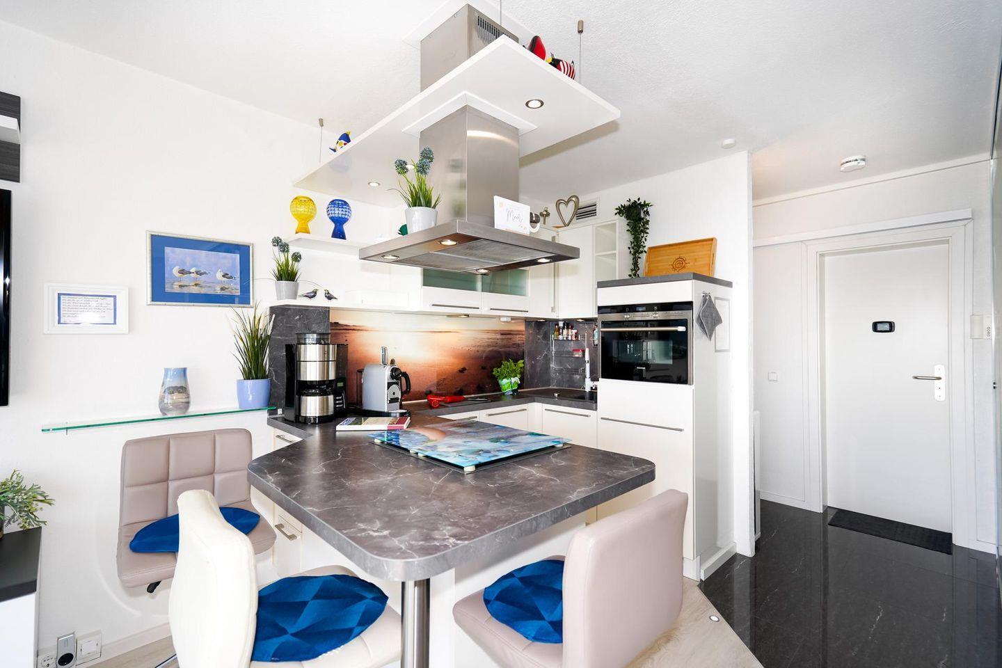Weiter geht es in den Küchenbereich, ausgestattet mit einer Einbauküche inkl. einem Geschirrspüler, einem Backofen mit Mikrowelle. Die wunderschöne Essecke mit Hochstühlen bietet drei Essplätze. Die Küche hat alles, was es für ein schönes Tischambiente braucht. Hier haben Sie haben alles, was Sie für die Zubereitung leckerer Gerichte mit hiesigen Erzeugnissen benötigen. Achtung scharfe Messer!