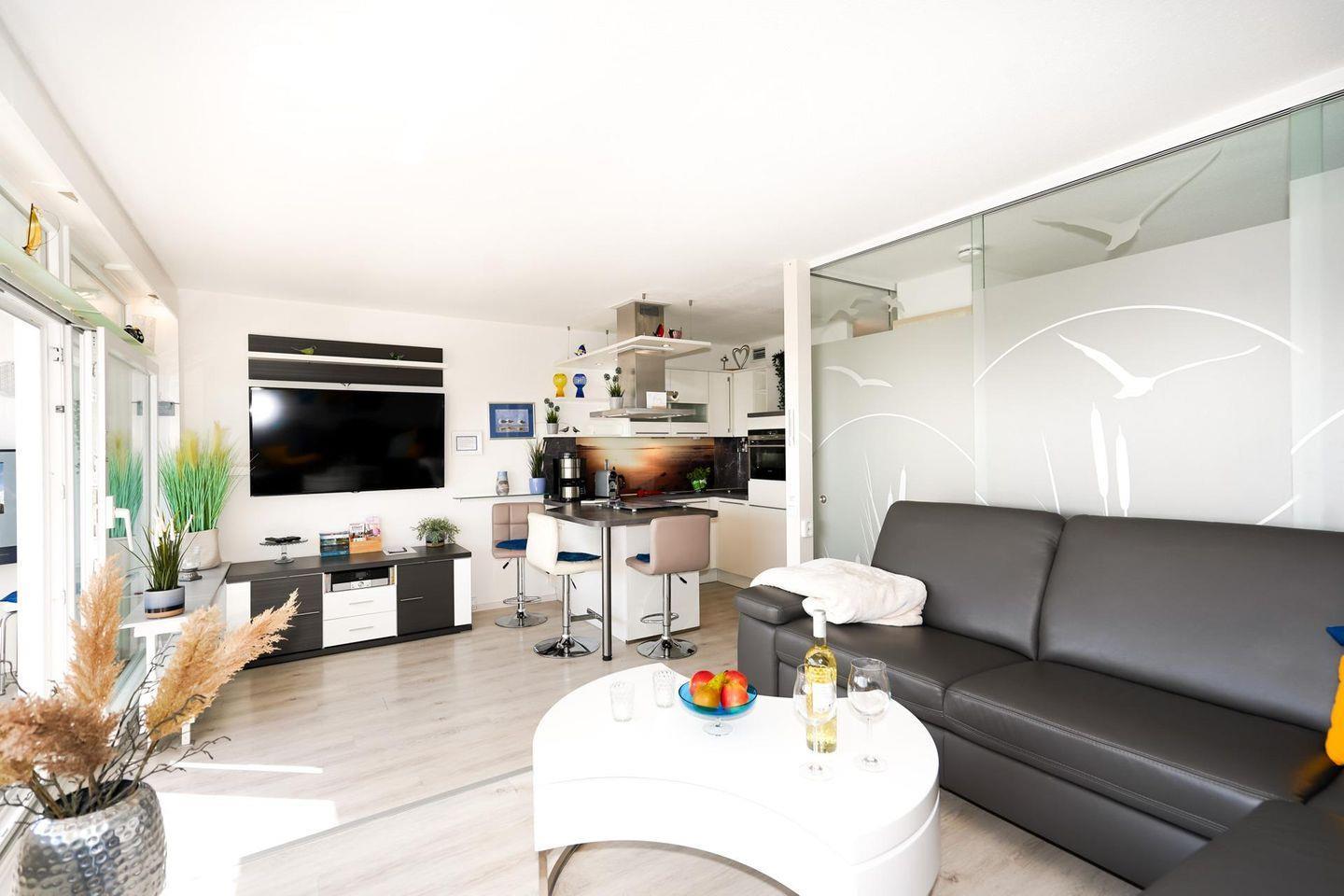 Das sich anschließende Wohnzimmer hat eine hochwertige lederbezogene Sofa-Landschaft mit Bettfunktion (1,40 m). Diese steht auf einem etwas erhöhten Podest, um von dort den traumhaften Ostseeblick zu genießen. Der Flat-TV hat eine Größe von 60 Zoll.