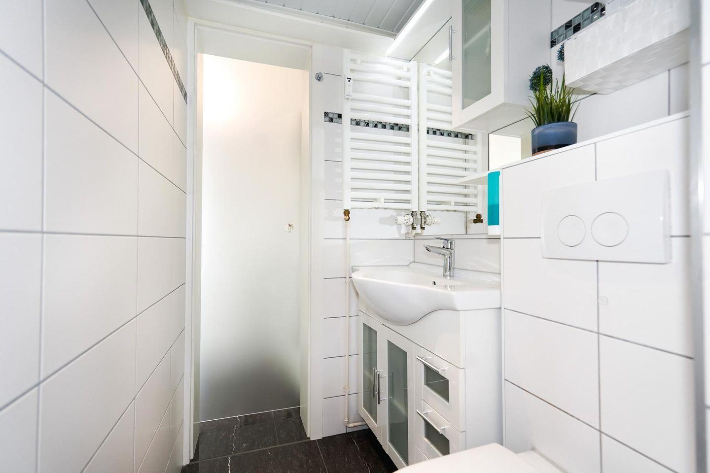 Das Badezimmer mit Dusche ist nicht zu groß und hat das, was man benötigt sowie etwas Staumöglichkeiten und einen Föhn.