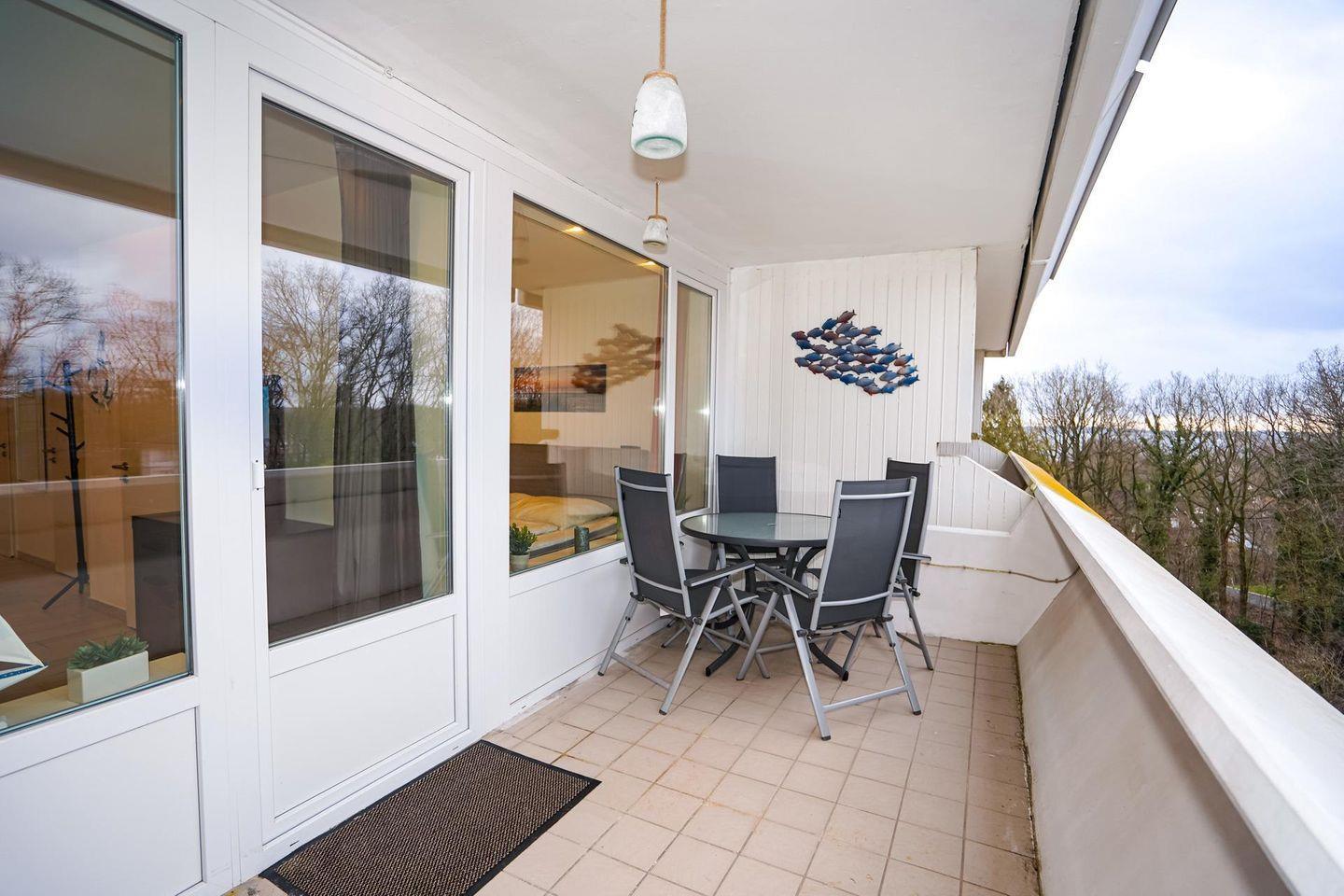 Auf dem großen überdachten Westbalkon mit Ausblick auf die Natur, im Winter ohne Laub an den Bäumen kann man auf der linken Seite auch einen Ausblick auf die nahe Ostsee erhaschen. Es ist ausreichend Platz für gemeinsame Mahlzeiten mit der ganzen Familie. Im schönen Strandkorb kann man entspannt mit einem Sundowner die Abendstimmung genießen.
