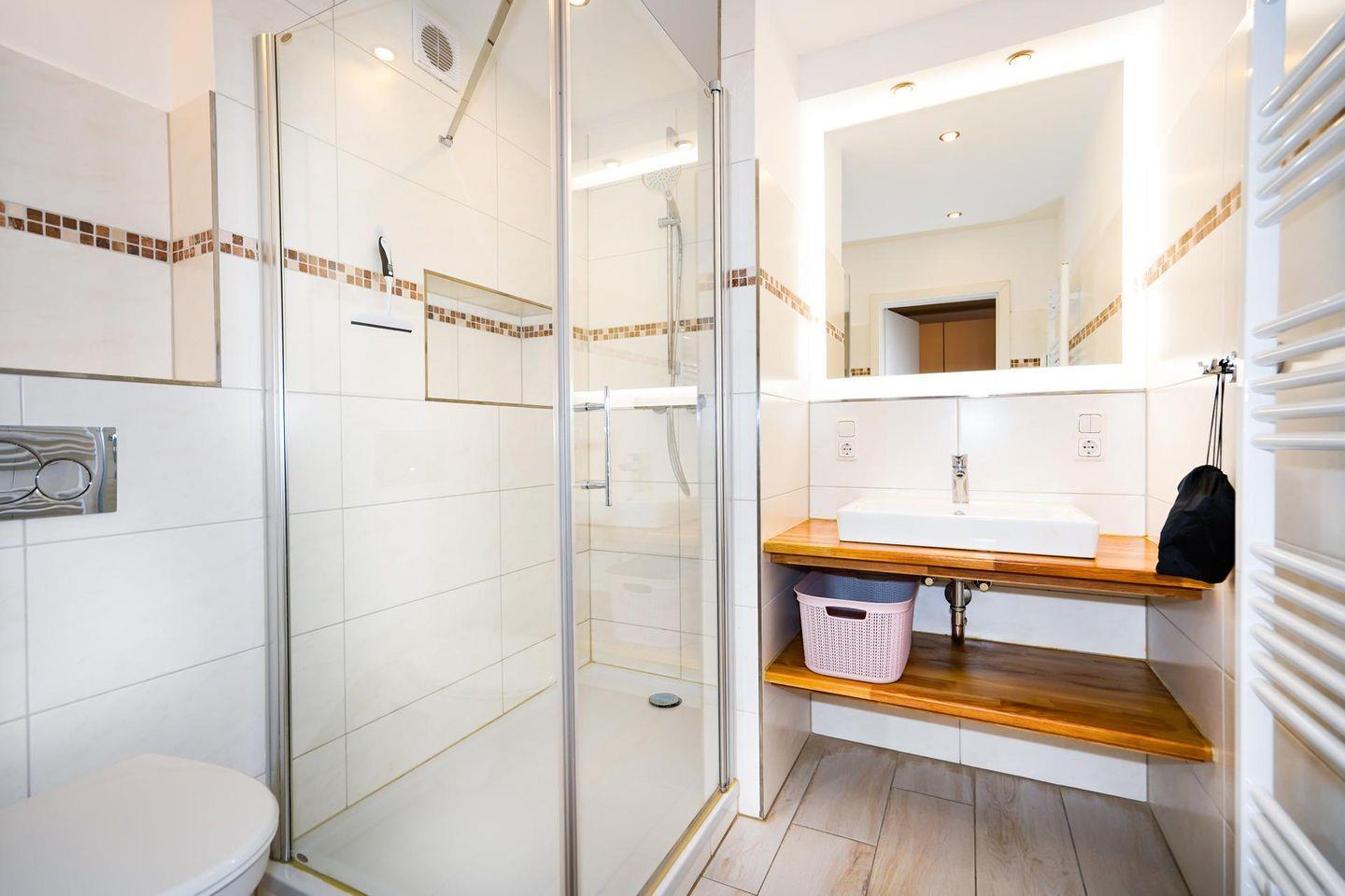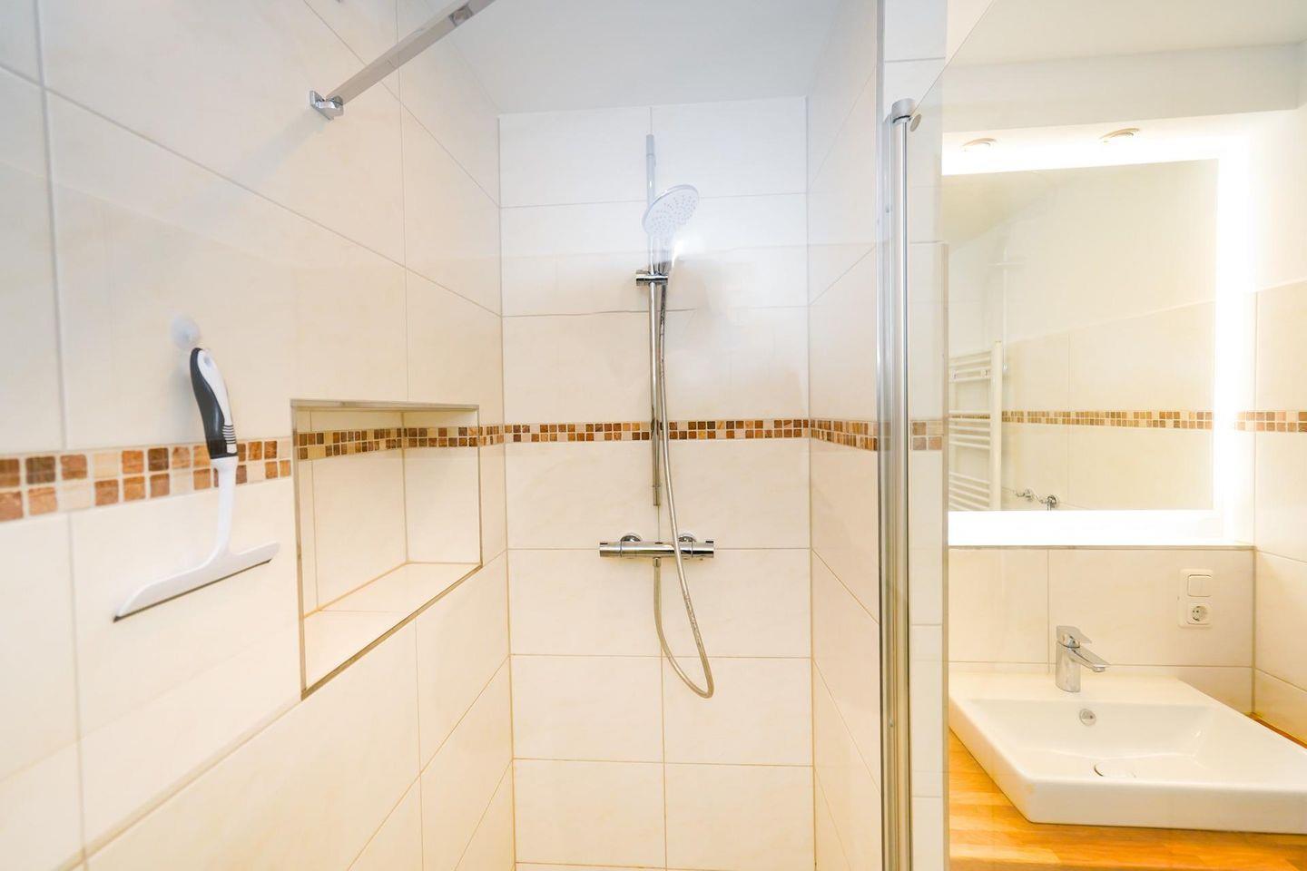Das ebenfalls innenliegende Badezimmer mit WC, großer Dusche und beheizbarem Handtuchhalter ist modern gestaltet und hell gefliest.