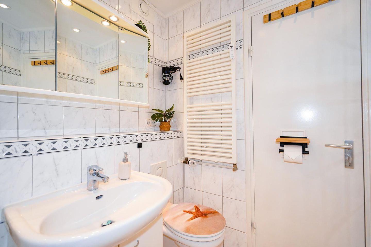 Das hell geflieste, innenliegende Badezimmer ist mit WC, Badewanne, Föhn und beheizbarem Handtuchhalter ausgestattet.