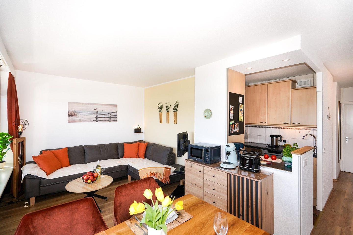 Die kleine und offene Küche ist mit Backofen, Herd, Spülmaschine, Mikrowelle, Wasserkocher, Kaffeemaschine und Toaster ausgestattet - ideal, um auch im Urlaub entspannt zu kochen.
