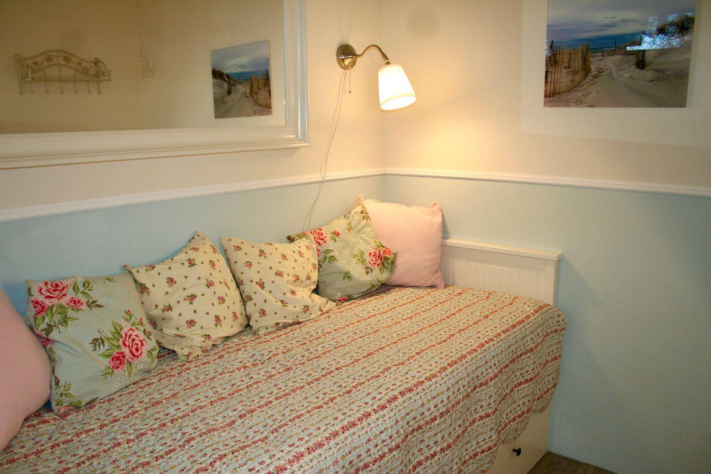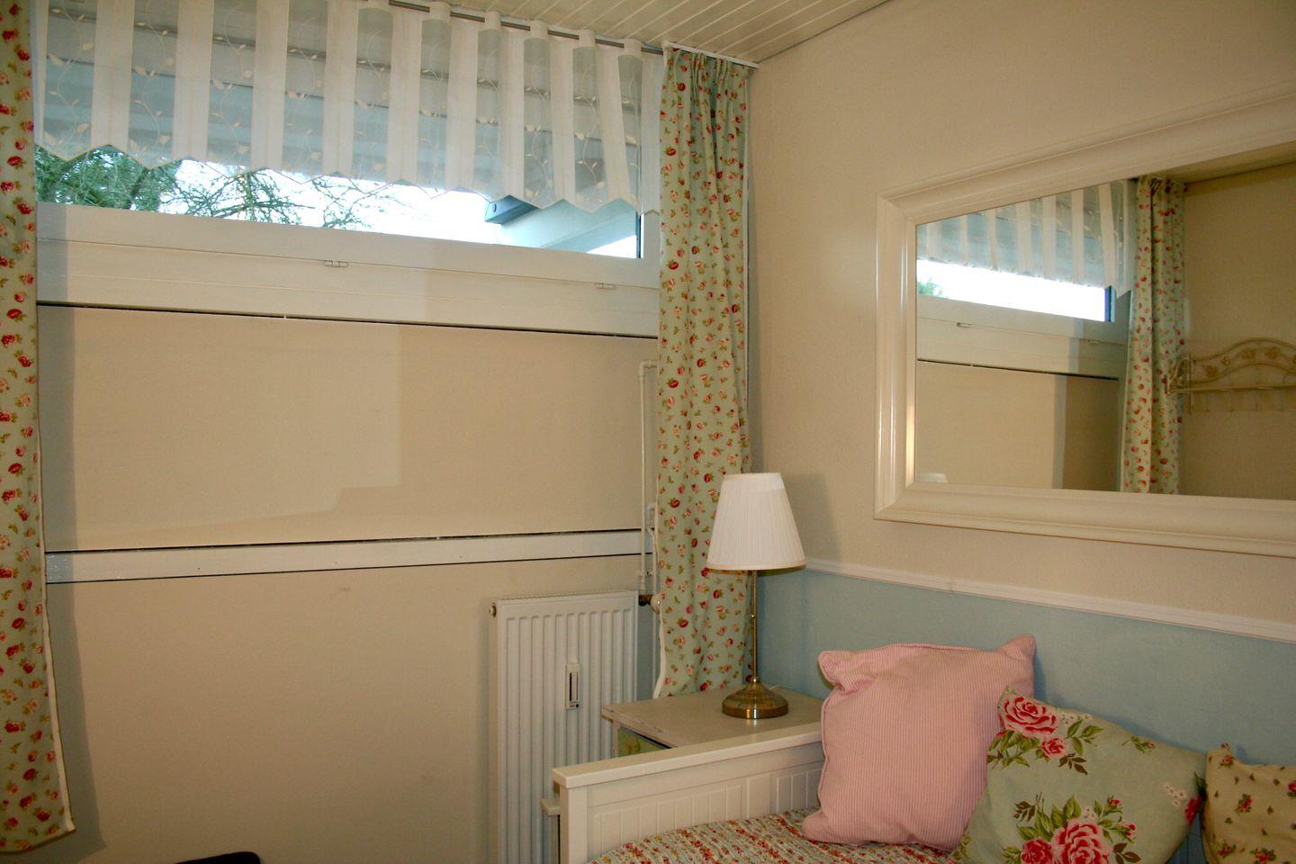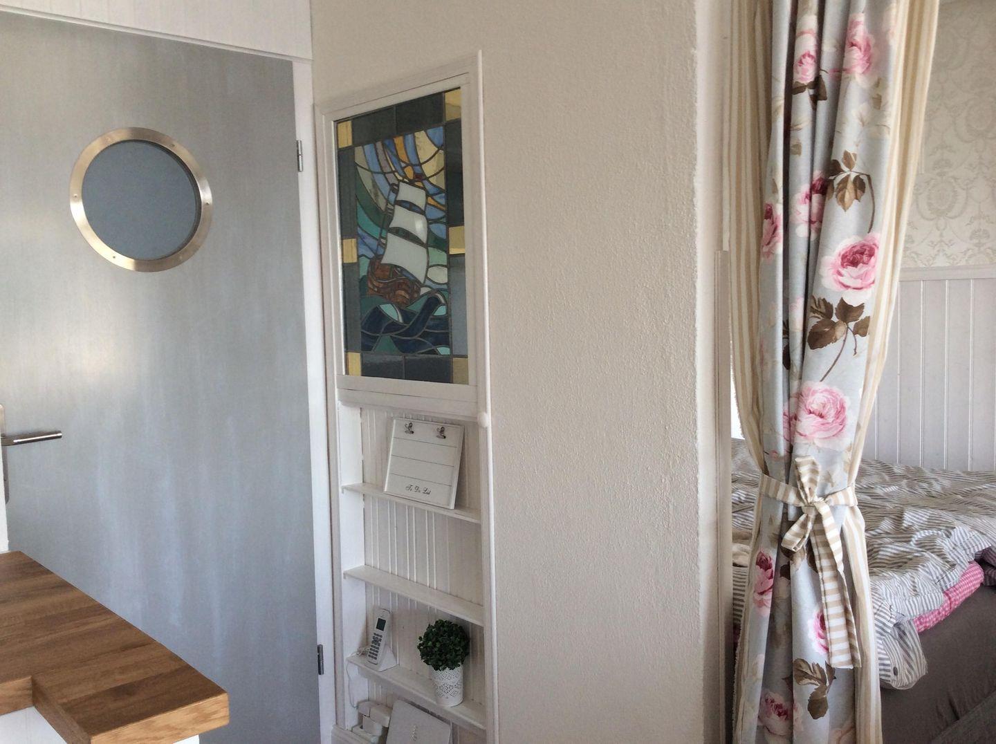 Die elegante Kapitänskoje mit seinem maritimen Bleiglas-Segler ist an das Wohnzimmer angeschlossen. Auf eine Wand zum Wohnzimmer wurde bewusst verzichtet, damit Sie morgens nach dem Aufwachen im 160 x 200 cm großen Boxspringbett den Blick auf das Meer genießen können. Tagsüber kann der Bereich durch den geschmackvollen Vorhang abgetrennt werden.