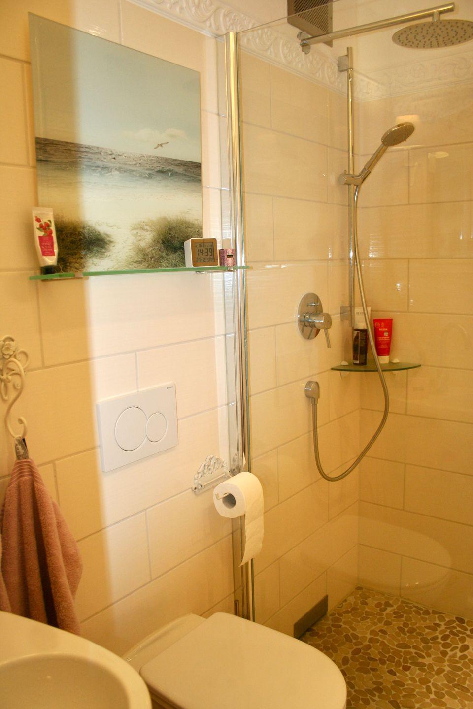 Das Bad mit seinem Strandambiente ist unsere kleine Wellnessoase. Die geflieste bodengleiche Dusche begeistert nicht nur durch sein Aussehen, sondern auch mit der zusätzlichen großen Regendusche. Das heiße Wasser ist übrigens superschnell da!
