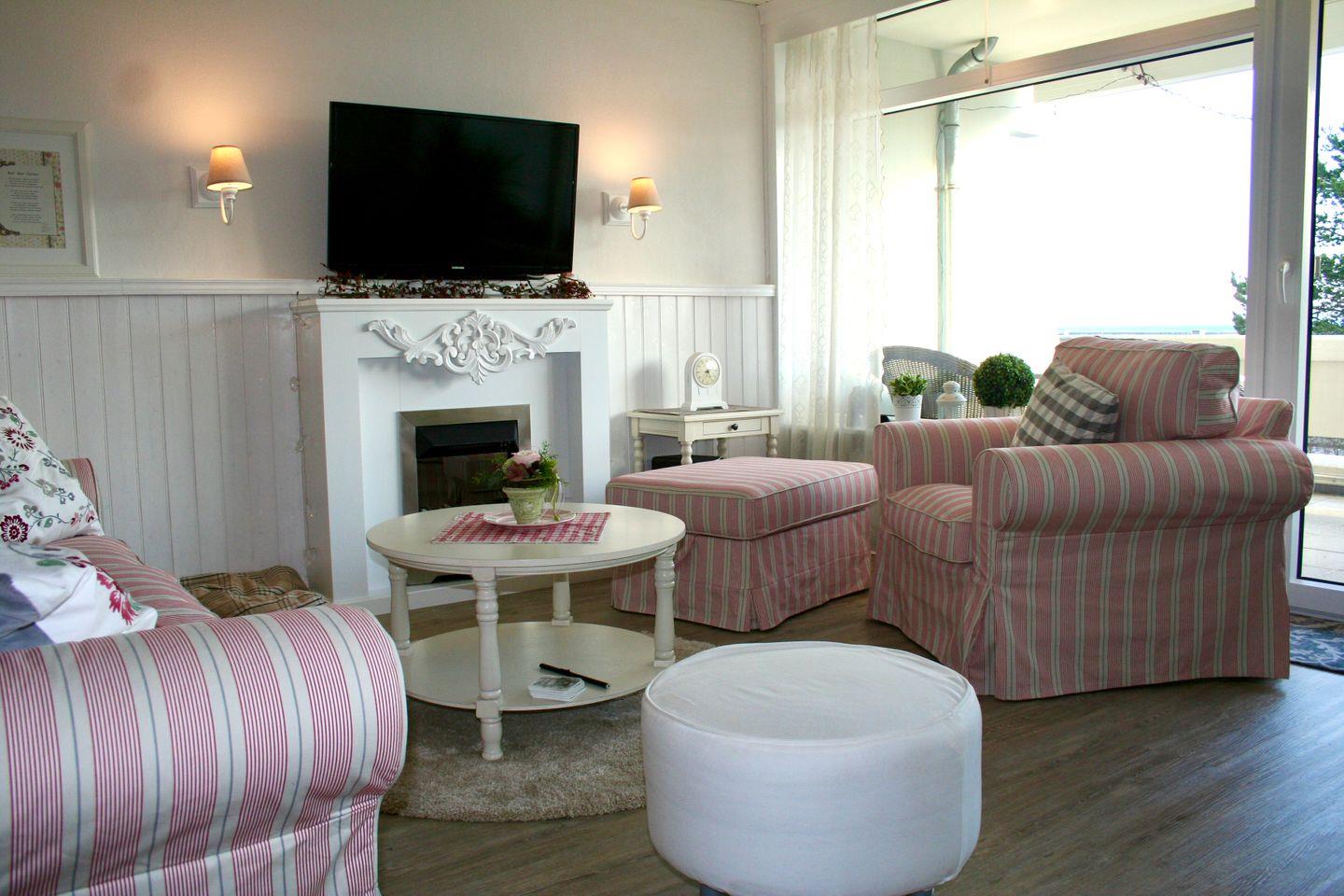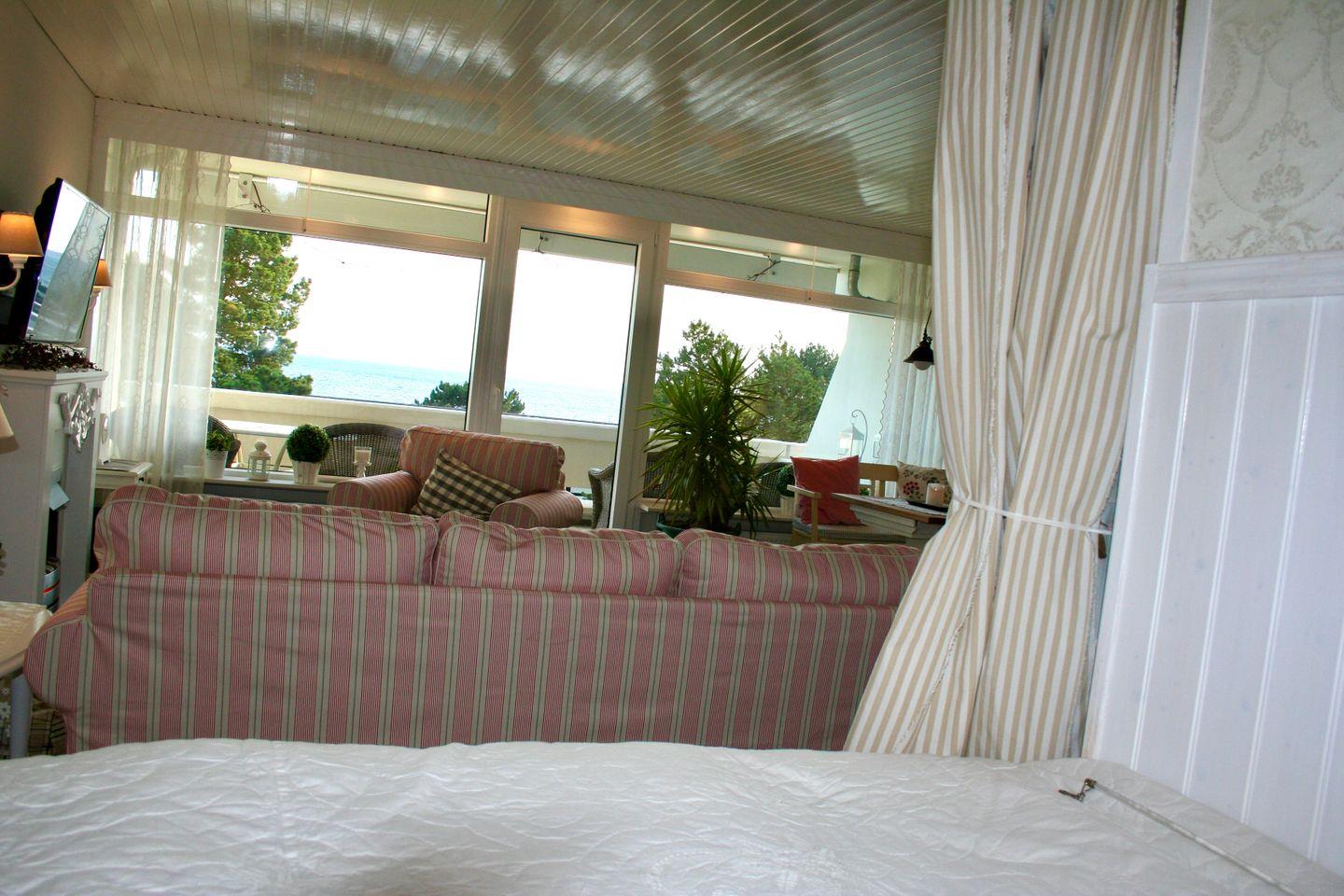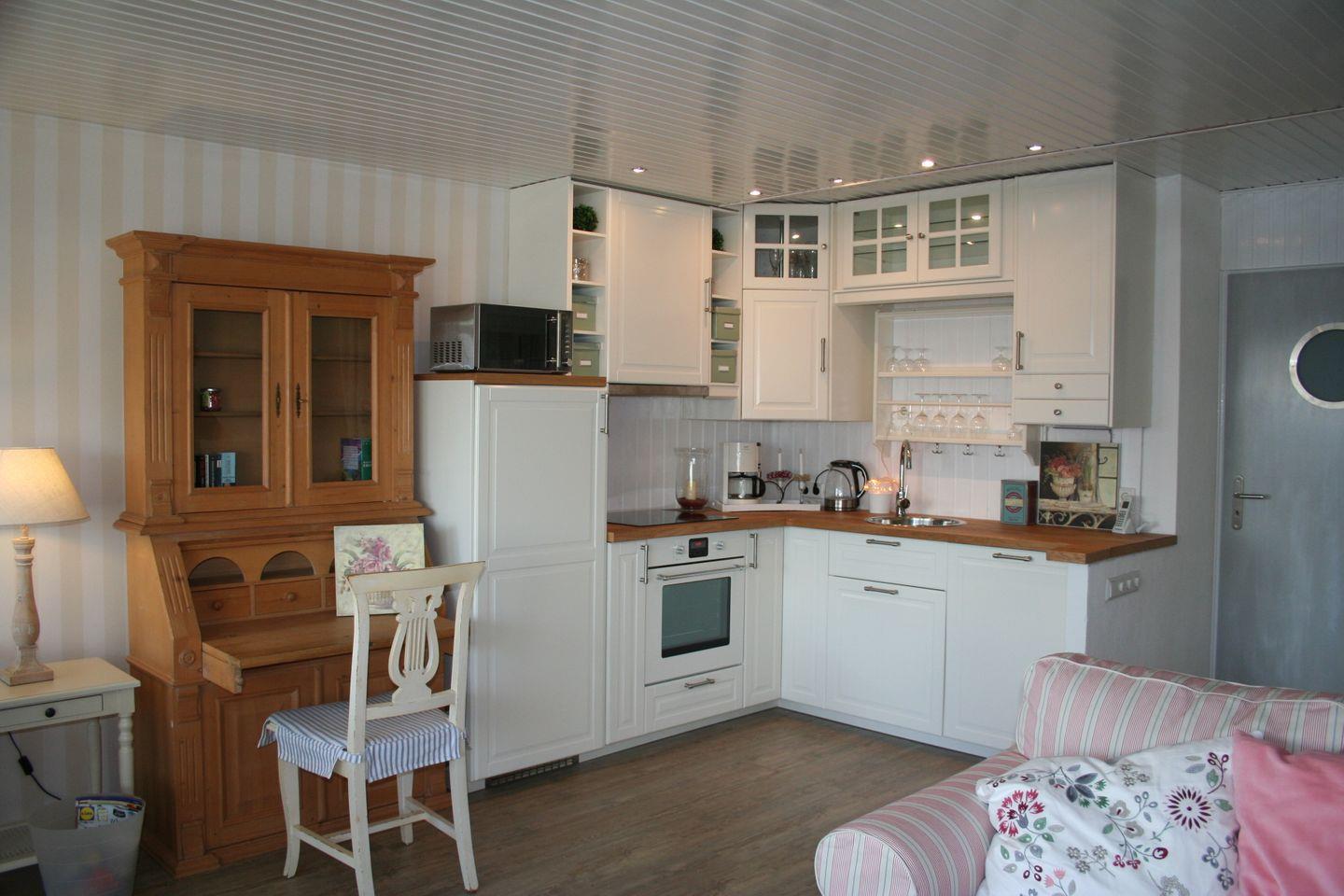 Herzstück der Wohnung ist das gemütliche Wohnzimmer mit Meerblick und Wohlfühlambiente. In der Küchenecke im Landhausstil bleiben keine Wünsche offen - Geschirrspülmaschine, Ceranfeld und Backofen, Mikrowelle, Dunstabzug, ein großer Kühlschrank mit Gefrierfach, Kaffeemaschine, Toaster und Wasserkocher sowie Geschirr für 4-6 Personen ist vorhanden.