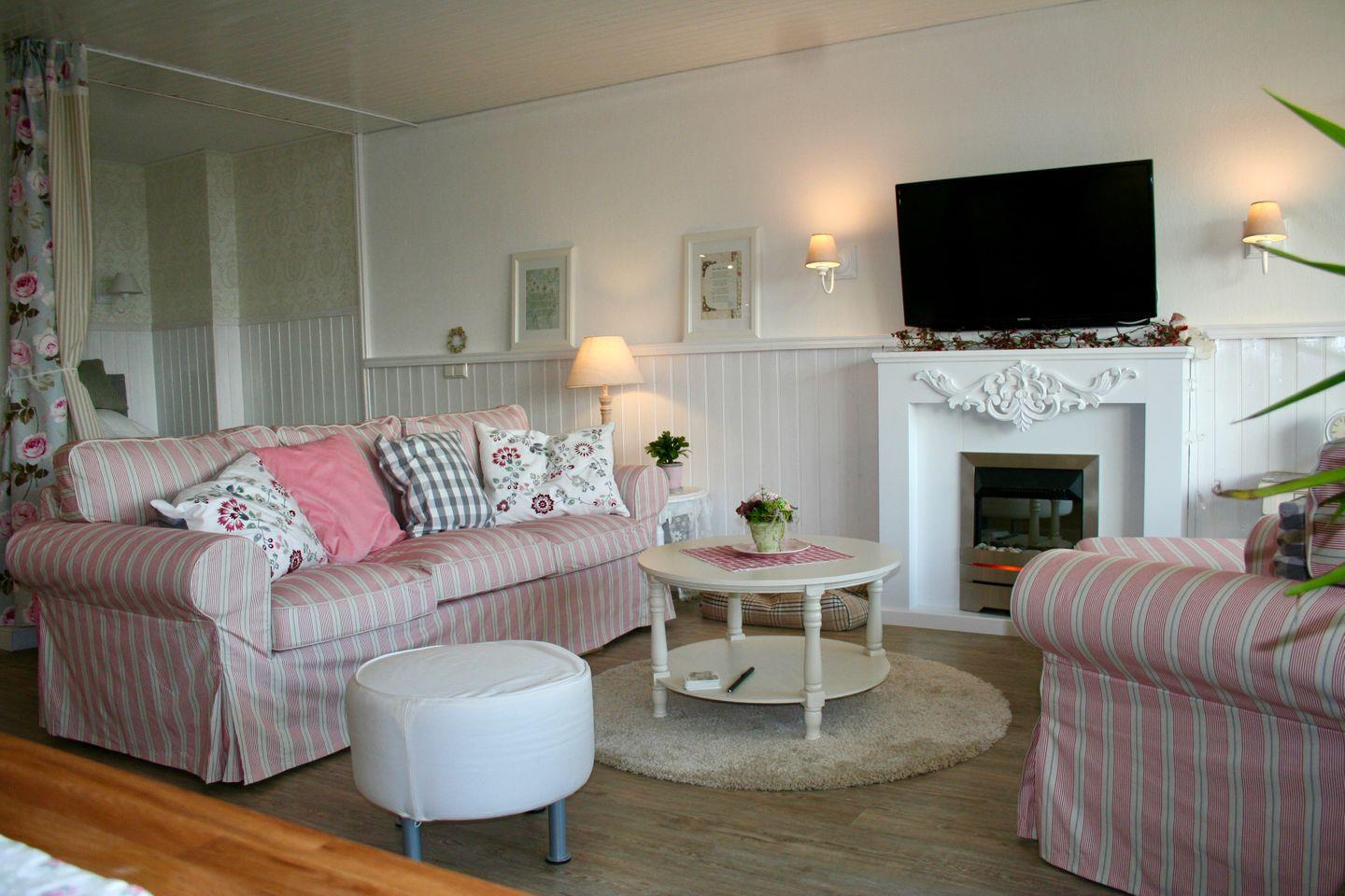 Gegenüberliegend befindet sich die Wohnzimmerecke mit der amerikanischen Beadbord-Paneele und eingesetztem, elektrischen Kaminofen, darüber der LED-TV. Drum herum platziert können Sie auf dem Dreierkuschelsofa und dem Sessel Platz nehmen, 2 Hocker ermöglichen das entspannte Füße-hochlegen.