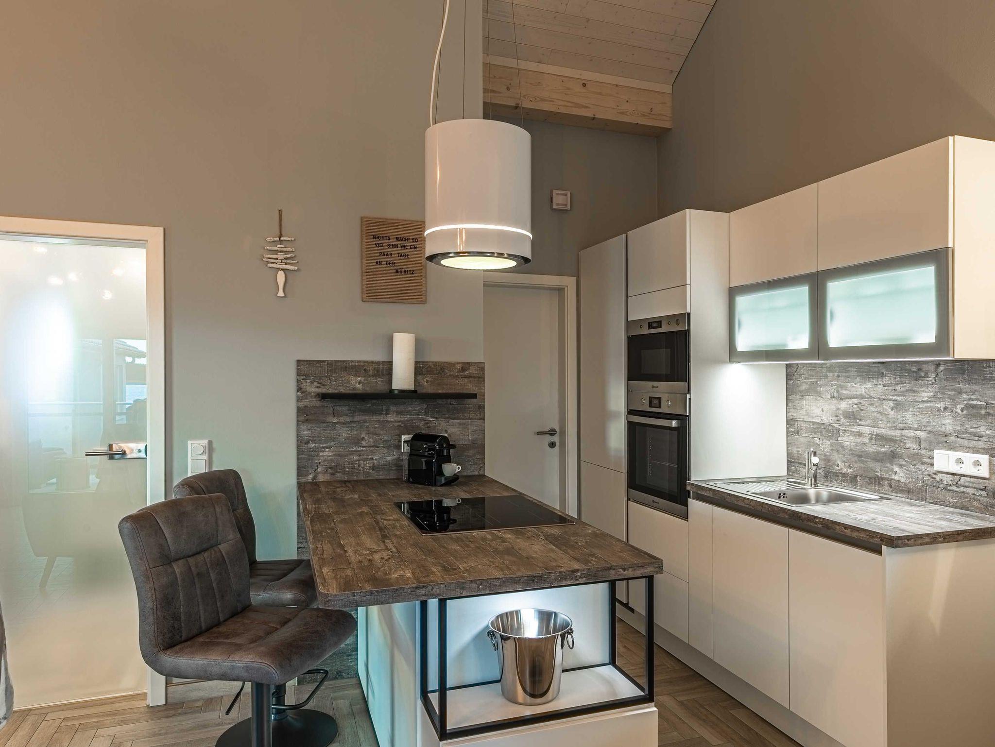 Und wenn Sie keine Lust haben essen zu gehen, bereiten Sie sich in der komplett eingerichteten Küchenzeile Ihr eigenes Dinner zu. Alles was es dazu braucht ist vorhanden. Moderne Küchengeräte, ob Mikrowelle, Multifunktionsbackofen oder Induktionskochfeld, ob geräumiger Kühlschrank oder großes Gefrierfach, machen das Schlemmen leicht. Und im Anschluss sorgt der Geschirrspüler schnell wieder für sauberes Geschirr. Zusätzlich steht eine Nespresso-Maschine mit Milchaufschäumer (6er-Kapsel-Grundausstattung vorhanden) oder wer es lieber klassisch mag eine French-Press zur Verfügung.