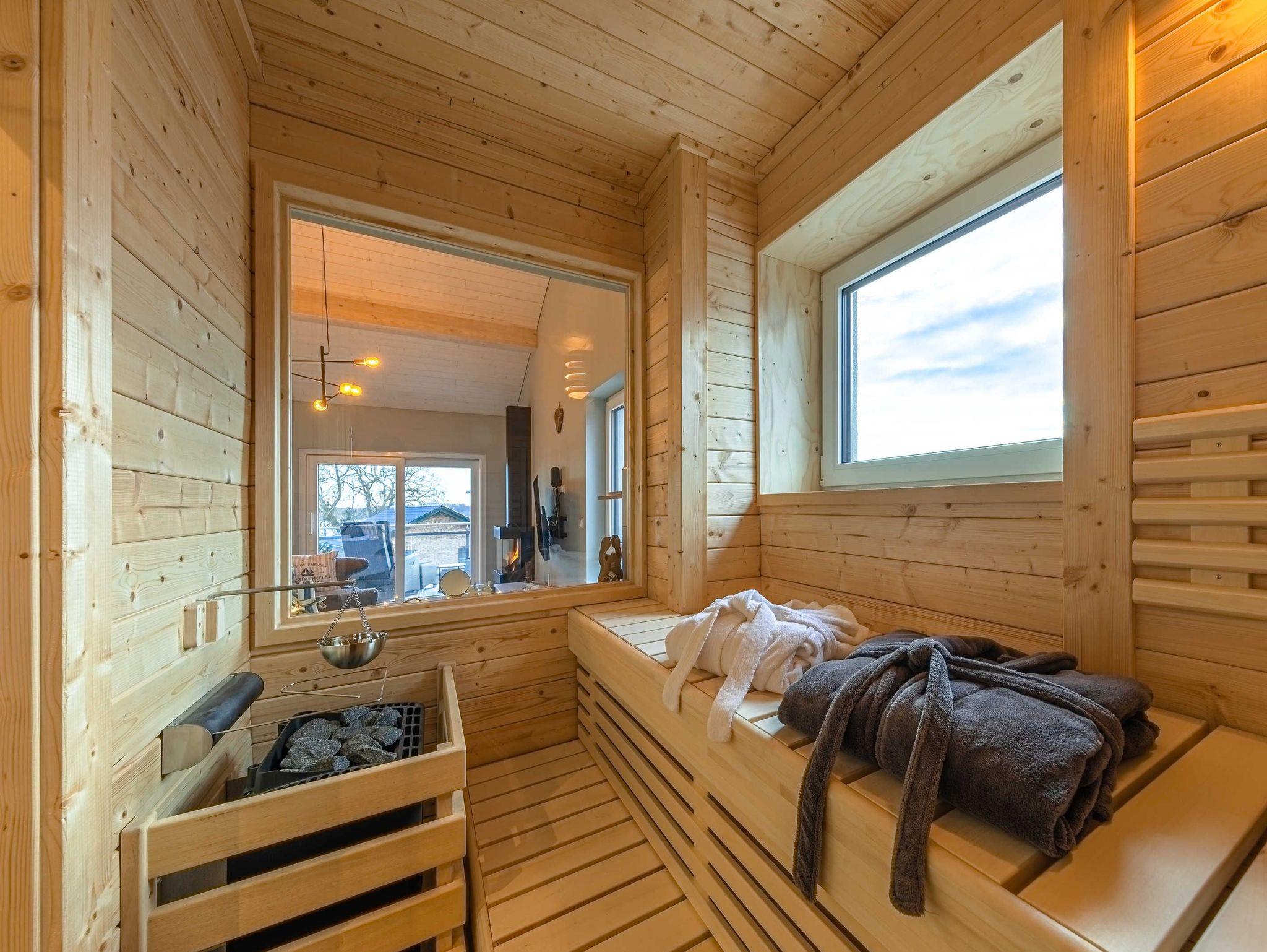 Die Böden der Ferienwohnungen sind mit hochwertigem Feinsteinzeug (Fliesen) im Fischgrät-Design belegt und eine Fußbodenheizung (pro Raum steuerbar) sorgt für behagliche Wärme. Im separaten Abstellraum steht Ihnen zur kostenfreien Nutzung eine Waschmaschinen-Trockner-Kombi (Waschmittel bitte mitbringen), nebst Bügeleisen und Bügelbrett zur Verfügung. Ein Insektenschutz ist ebenfalls vorhanden wie auch ein kostenfreier WLAN-Zugang. Die bodentiefen Fenster und Terrassentüren und das Fenster in der Sauna sorgen für lichtdurchflutete Räumlichkeiten, die über teilweise auch elektrisch betriebene Schiebeläden für Privatsphäre oder Sonnenschutz sorgen. Das Dach ist mit einem zusätzlichen Hitzeschutz ausgestattet, die auch an heißen Tagen zusammen mit den geschlossenen Schiebeläden eine angenehme Temperatur in den Räumen für einen erholsamen Schlaf sorgen.