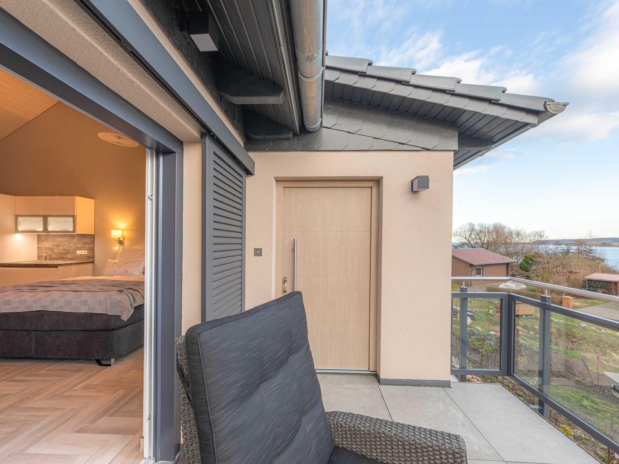 Die Ausrichtung ist nach Süd-West. Der Zugang zum Objekt erfolgt über eine Außentreppe, die nur zu diesem Objekt führt. Die voll ausgestattete Wohnung verfügt über eine eigene Sauna und einen Gaskamin. Von der großzügigen Balkon-Terrasse hat man einen freien Blick auf die Große Müritz. Privatsphäre und Erholung werden hier GROß geschrieben.